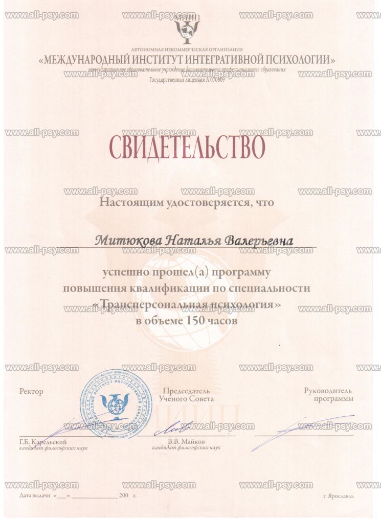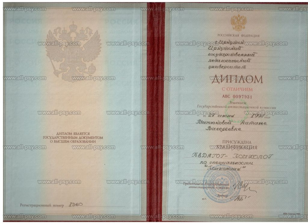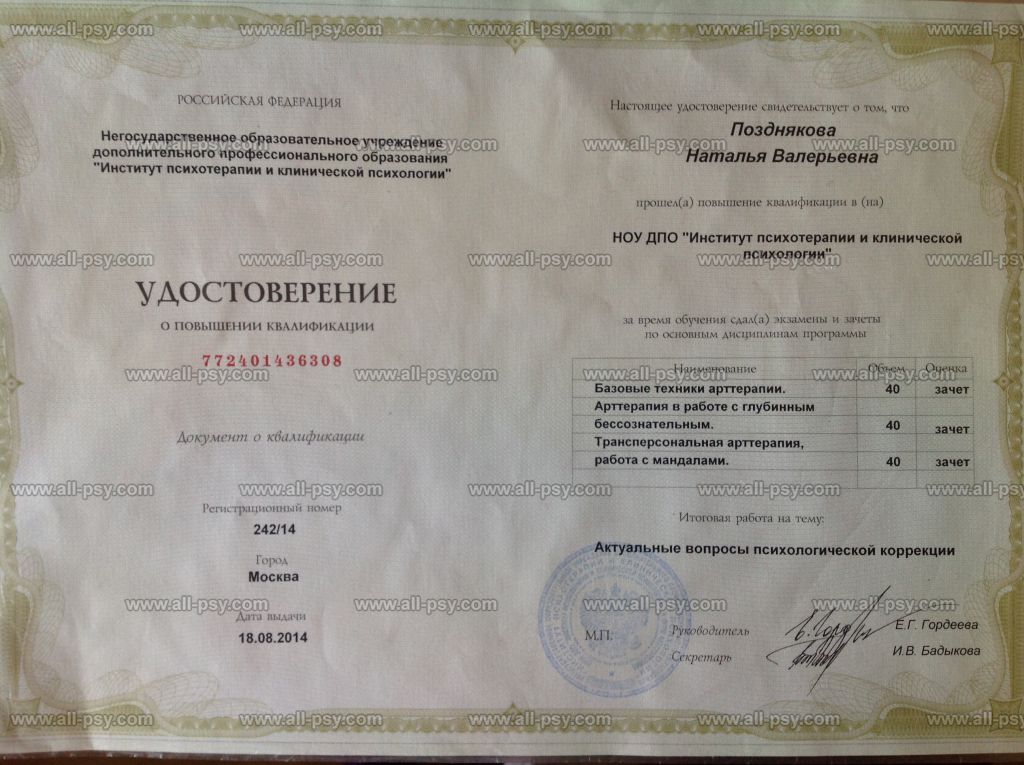 Высшее психологическое, к.пс.н, PhD (доктор психологии в философии), клинический психолог, российские и международные долгосрочные программы повышения квалификации по психотерапии, веду группы и консультации с 1995 г.,