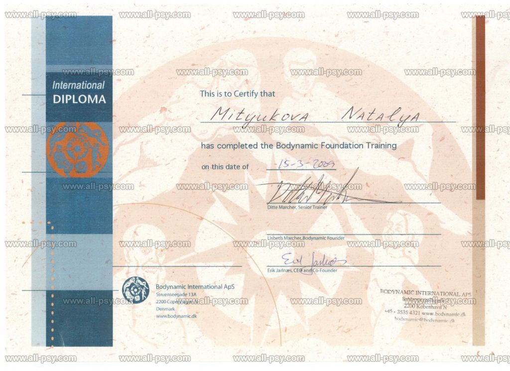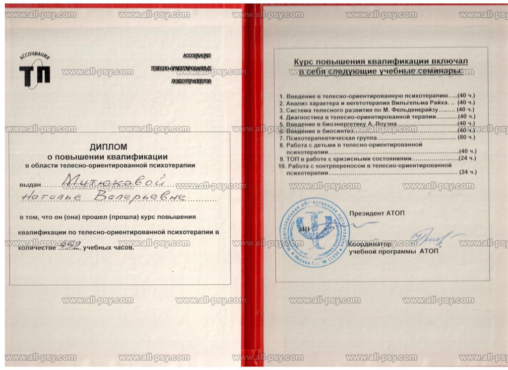 - Курсы по психологическому консультированию и психотерапии: психосоматика, телесно-ориентированная психотерапия, терапия сексуальных проблем, групповая психотерапия, клиническая психология