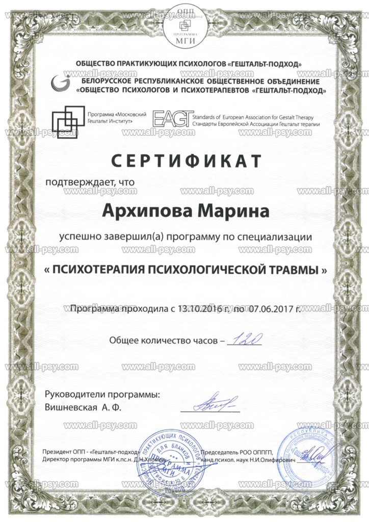 10.2016-06.2017 Специализация МГИ «Психотерапия психологической травмы»