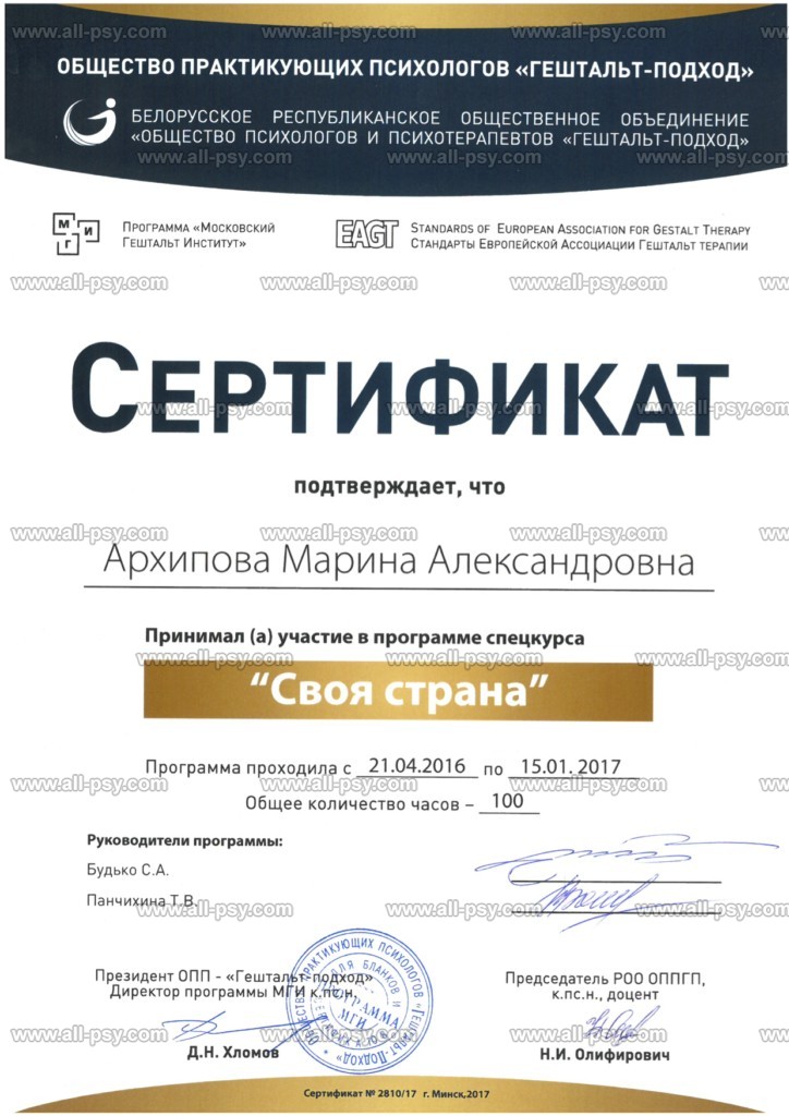 - 1900 часов в различных форматах учебы, сертифицирована как гештальт-терапевт