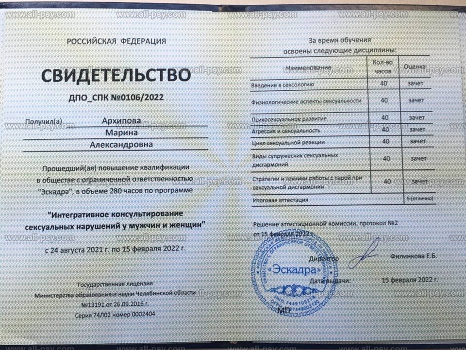08.2021 - 02.2022 Повышение квалификации ООО «Эскадра», Росс.Федерация, «Интегративное консультирование сексуальных нарушений у мужчин и женщин»
