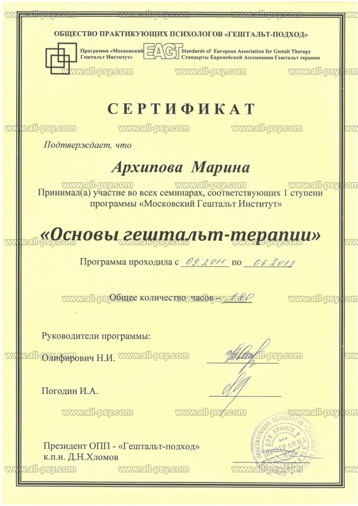 09.2011-06.2012 Программа Московского Гештальт Института (МГИ) «Основы гештальт терапии»