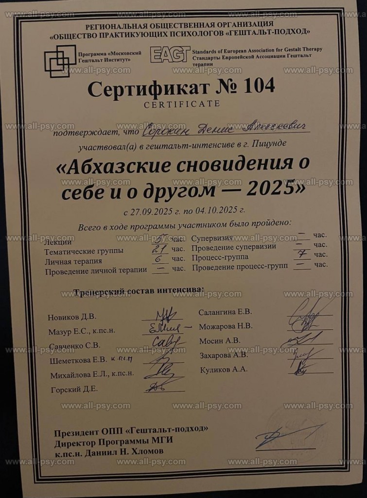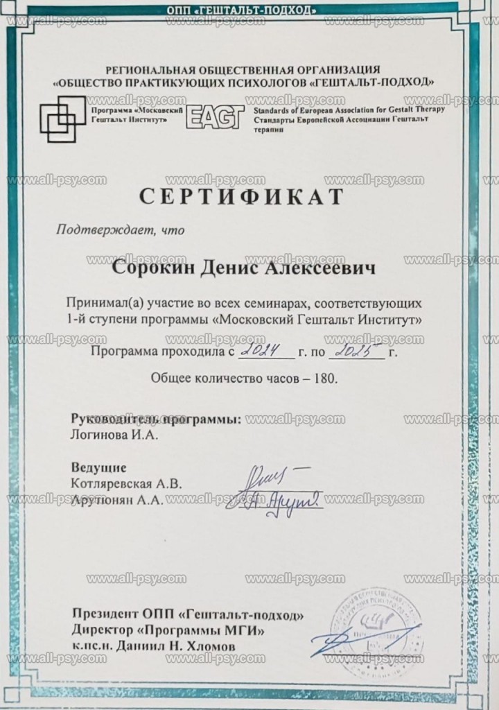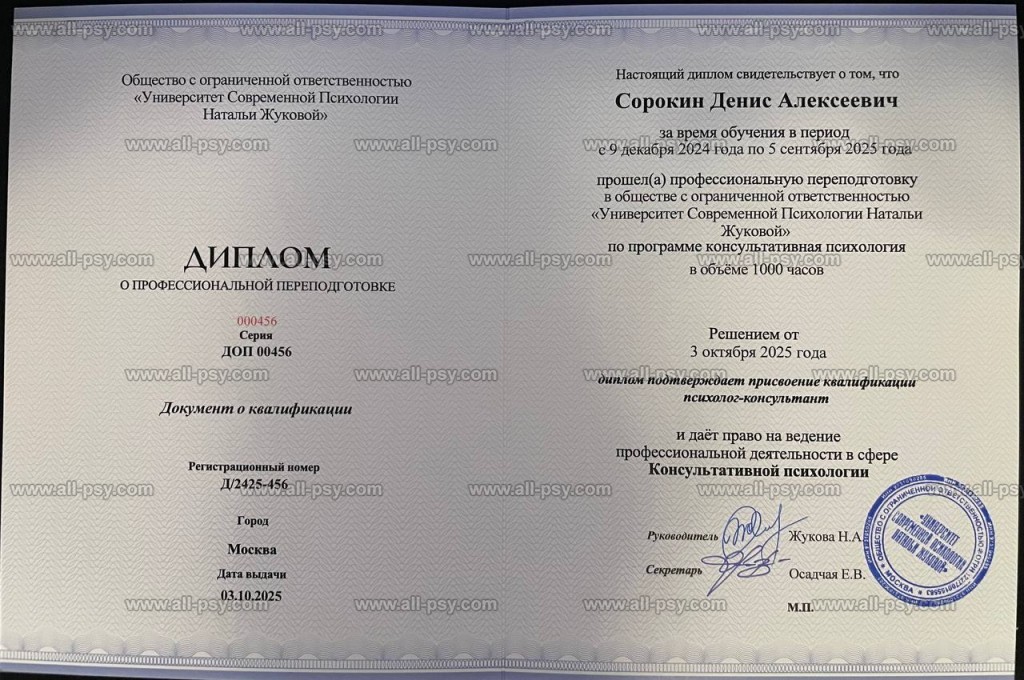 Закончил обучение в УСП (Университет Современной Психологии Натальи Жуковой) по специальности "Психолог-консультант" и 1 ступень программы МГИ (Московский Гештальт Институт). Сам нахожусь в терапии непрерывно с июля 2023 года.