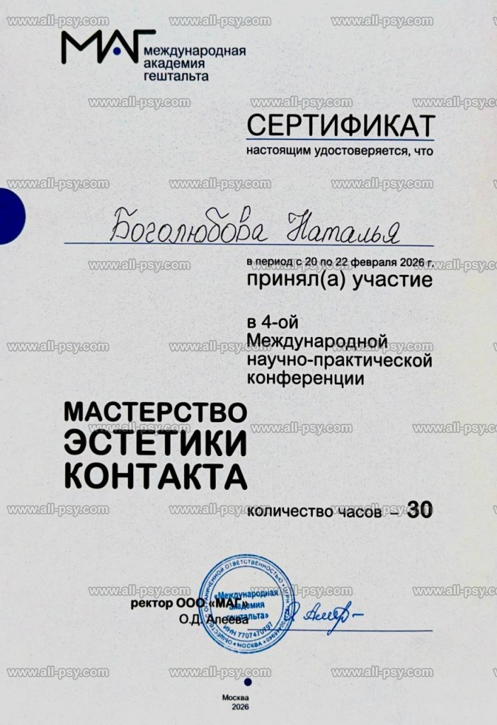- 2022 - 2025. Международная Академия Гештальта (МАГ): 2 ступень. Гештальт-терапия, как метод прикладной психологии. 906 часов