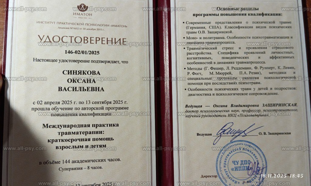 Работаю с клиентами индивидуально и в группах, применяю современные методы психотерапии (ДПДГ, ImTT, символдрама, терапевтические визуализации).