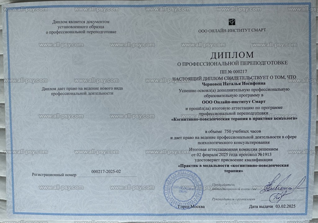 Моя работа строится на когнитивно-поведенческой терапии (КПТ) — доказательном подходе, который помогает изменить автоматические мысли и реакции, и элементах Эриксоновского гипноза, открывающих доступ к внутренним ресурсам.