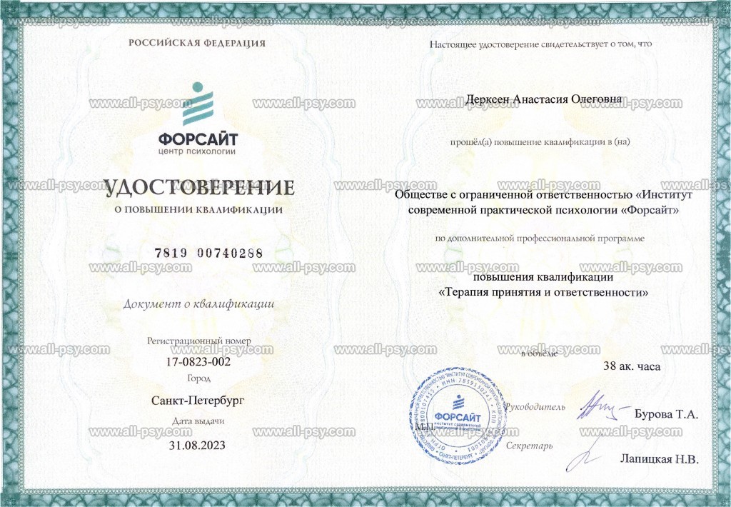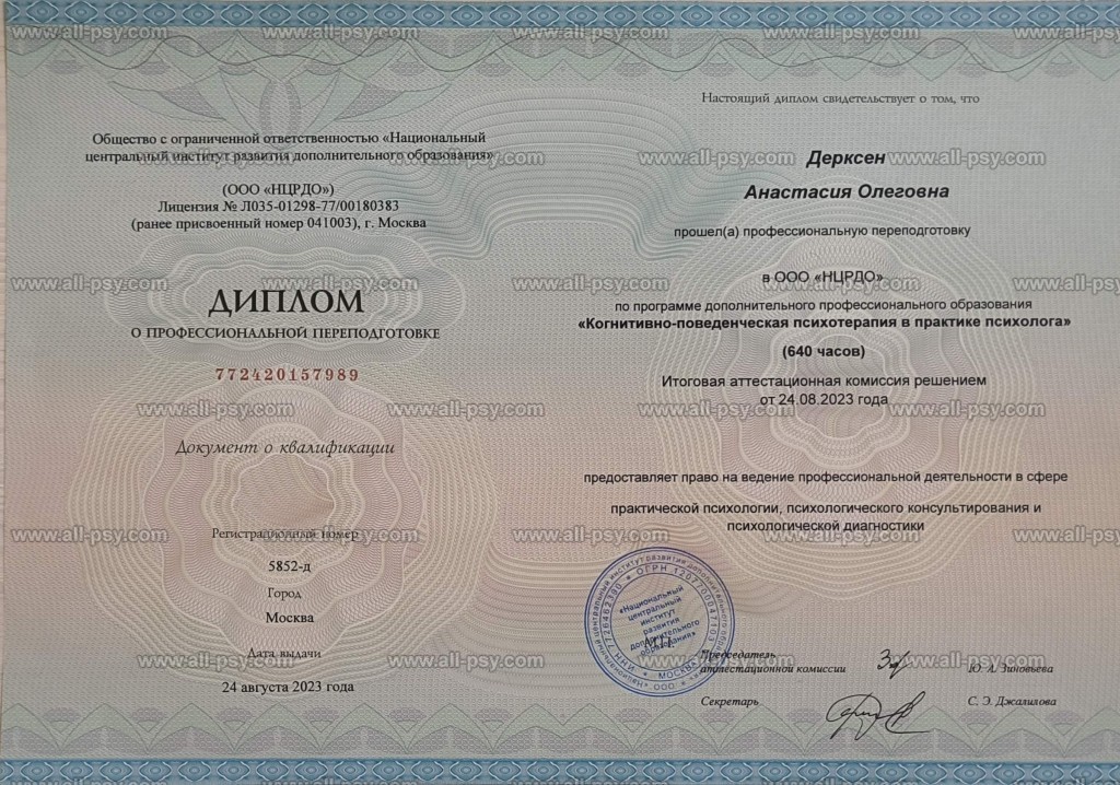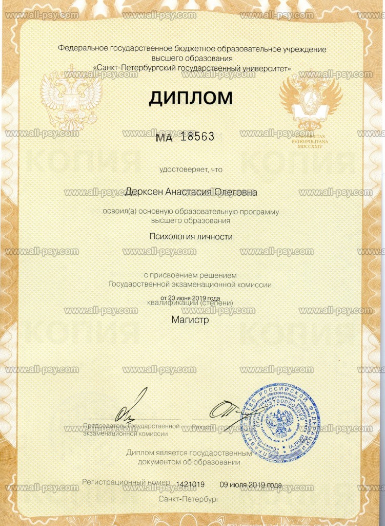 Образование: Я закончила магистратуру СПбГУ по направлению "индивидуальное психологическое консультирование". Ежегодно повышаю свою квалификацию и остаюсь в курсе современных тенденций в психологическом консультировании.