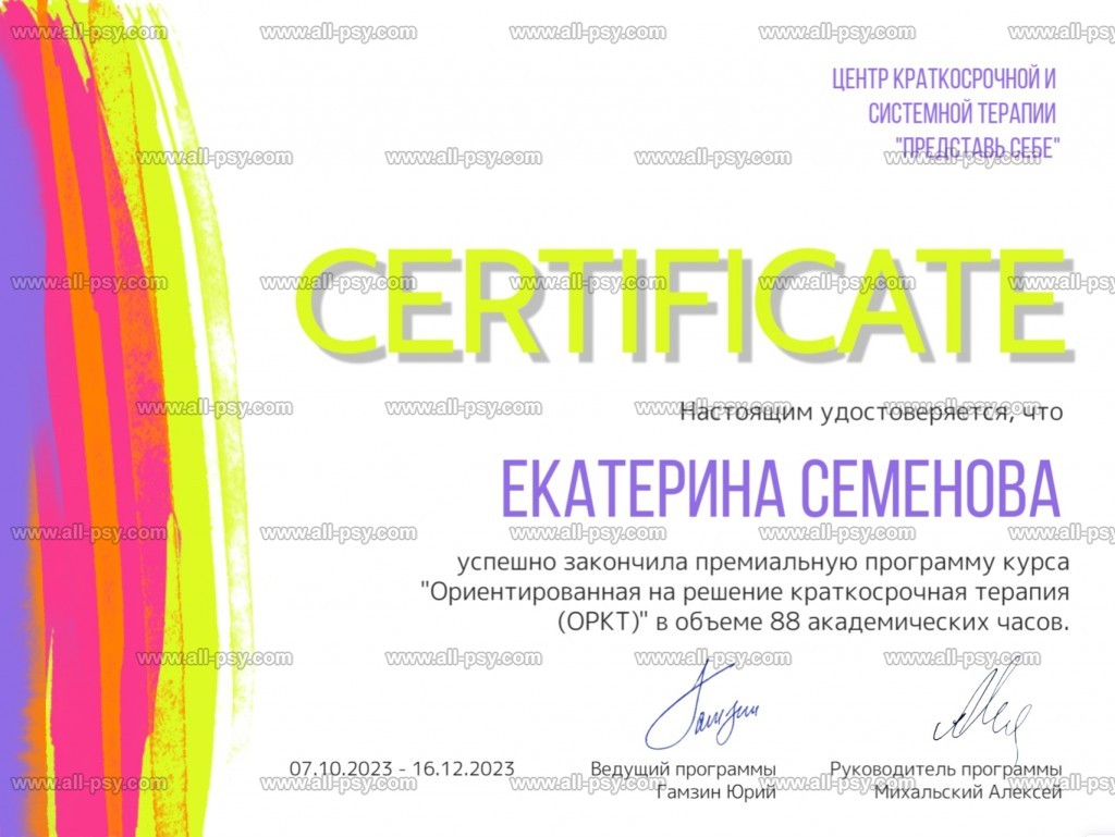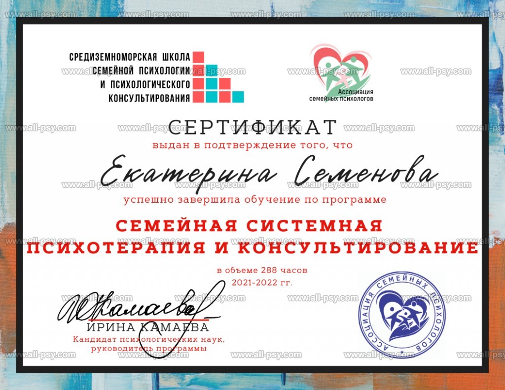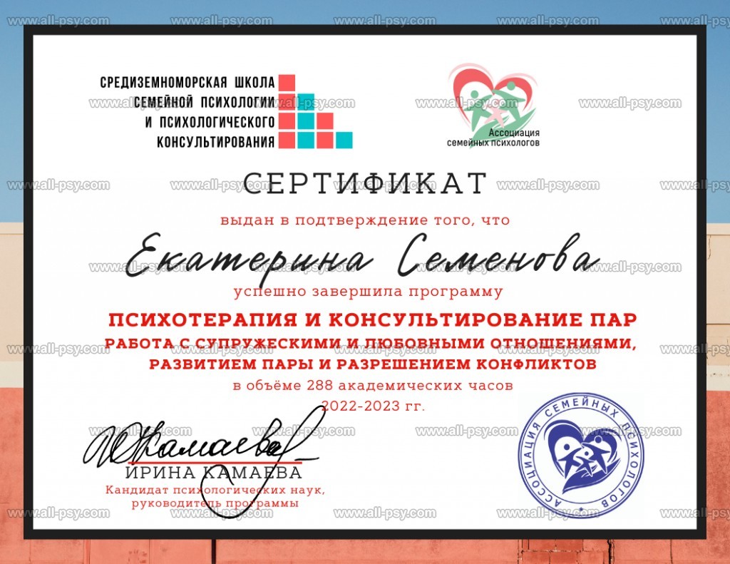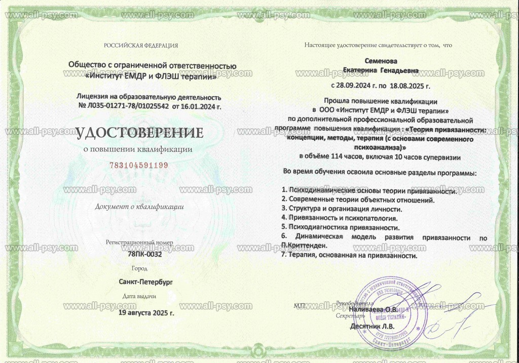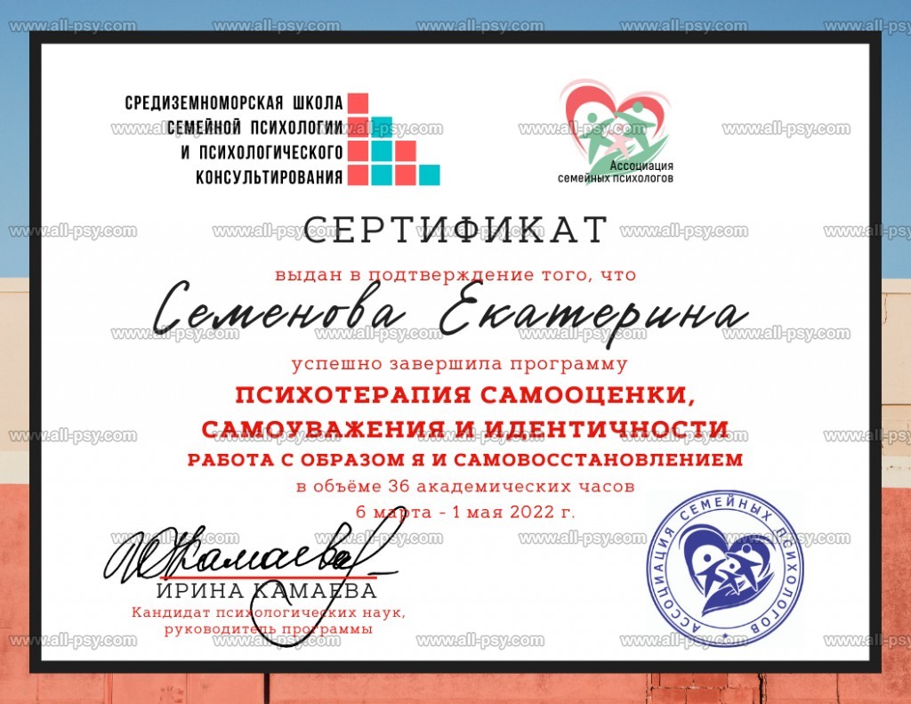 Ознакомиться подробнее с информацией обо мне, моем образовании и навыках можно на сайте: https://psy-semenova.ru/ и в моём телеграм-канале: https://t.me/psy_e_semenova