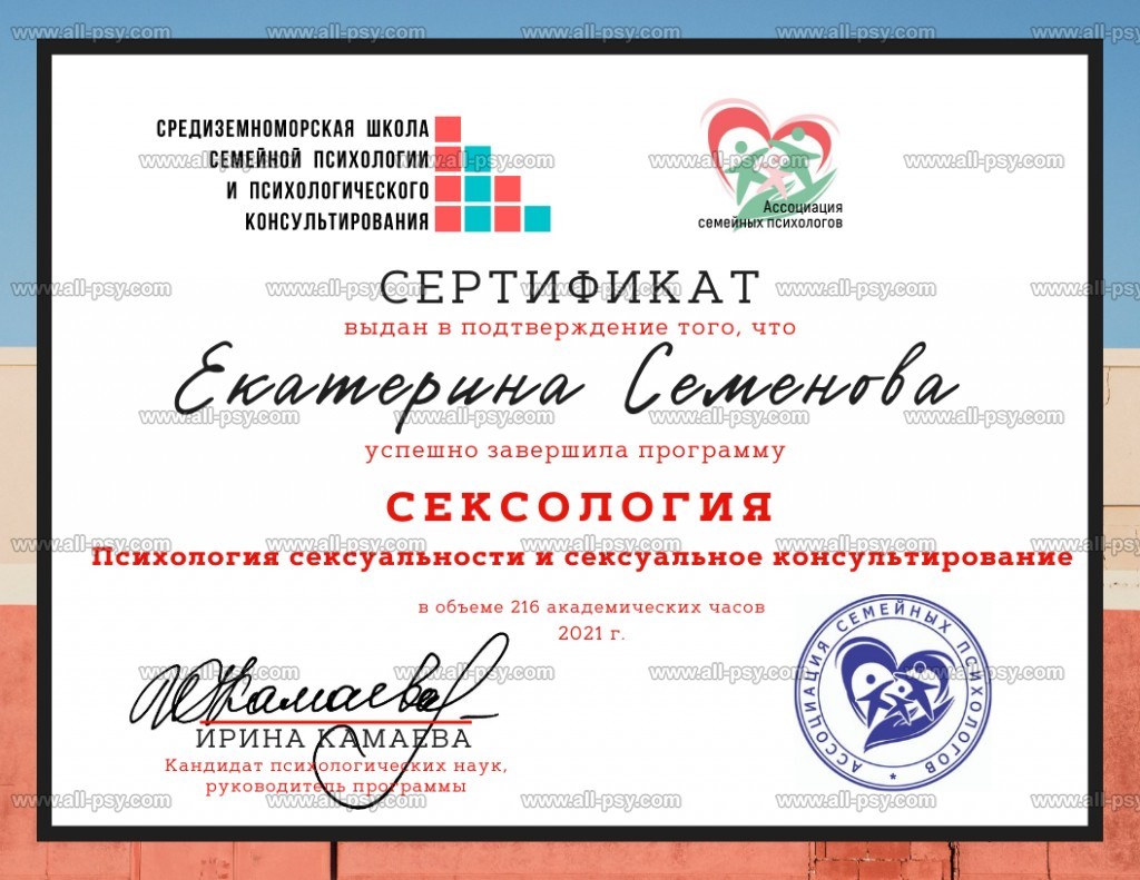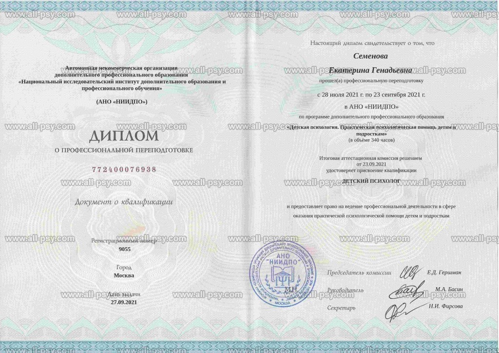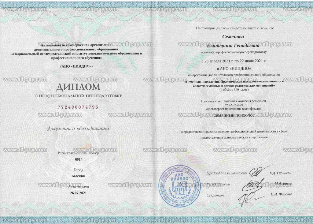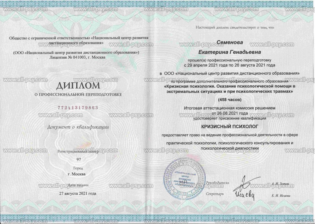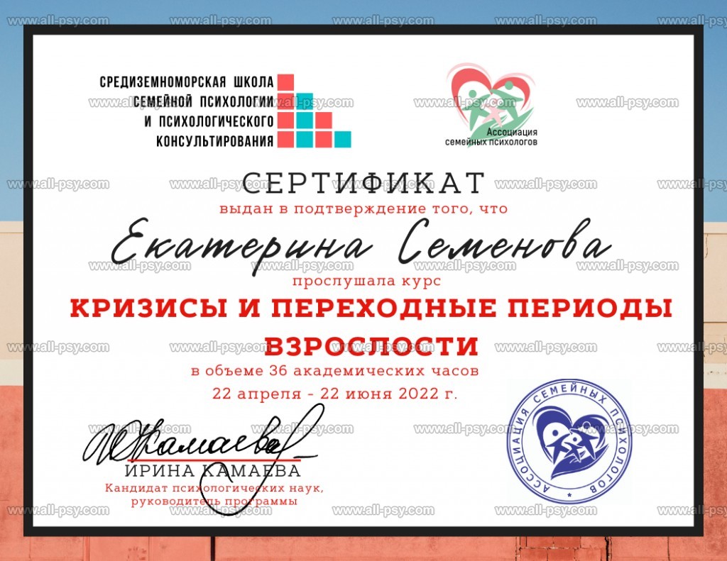 Дополнительно имею квалификации семейного, кризисного и детского психолога.