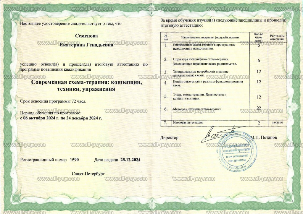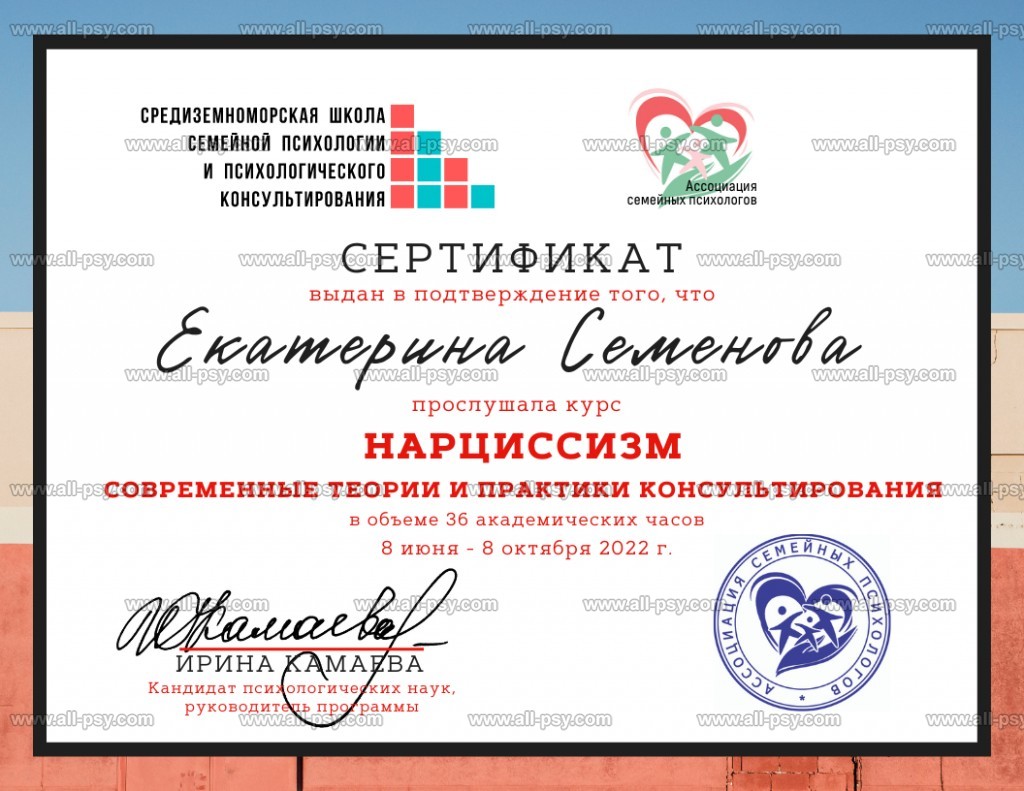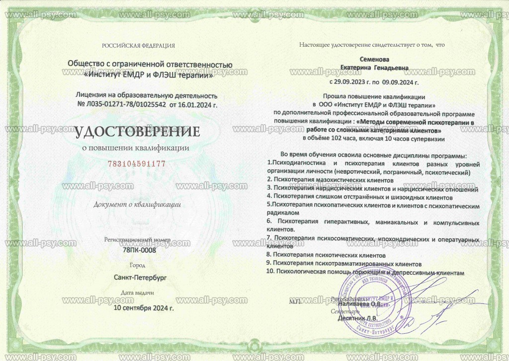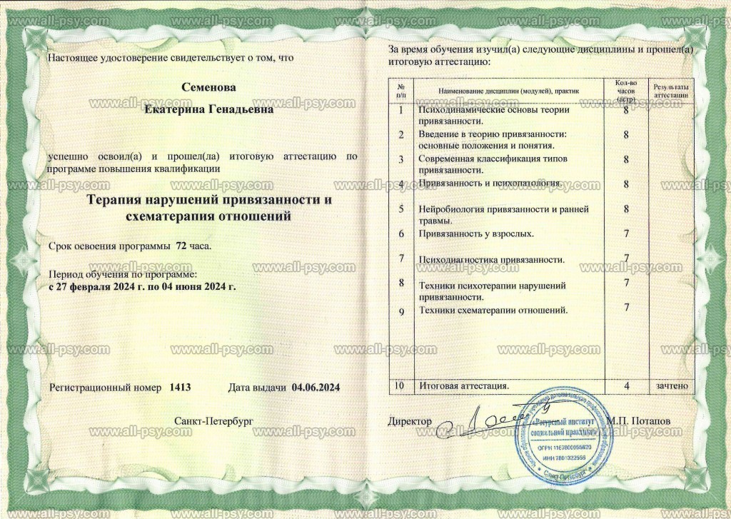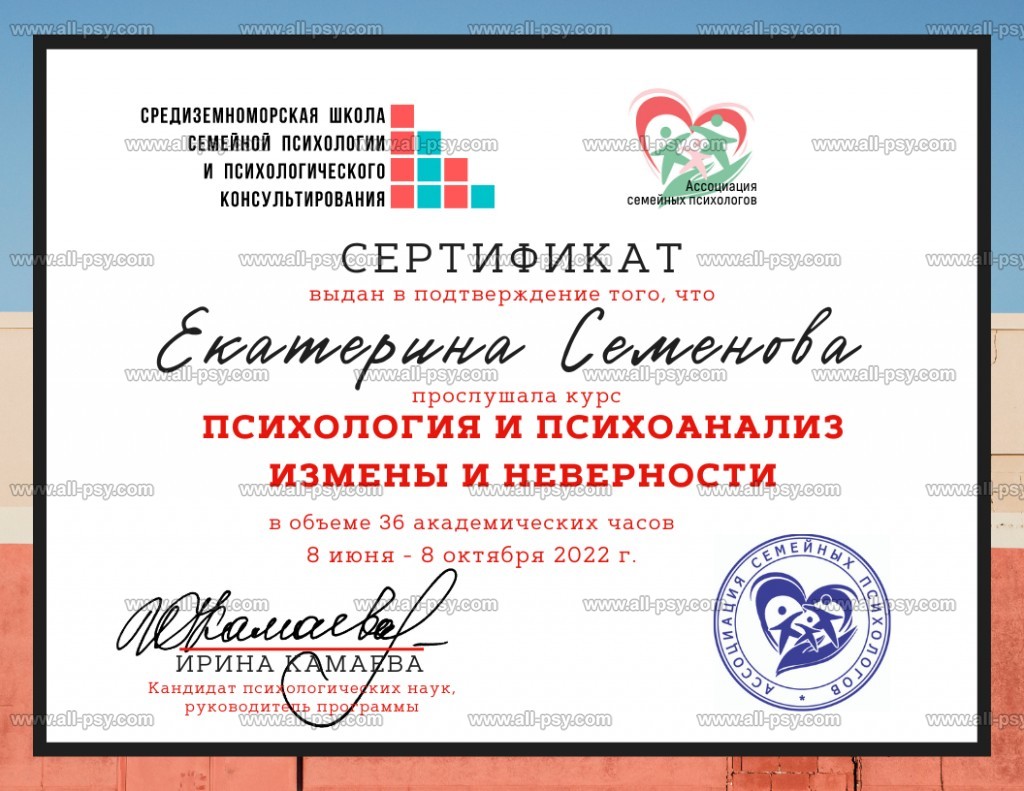 Дополнительно имею квалификации семейного, кризисного и детского психолога.