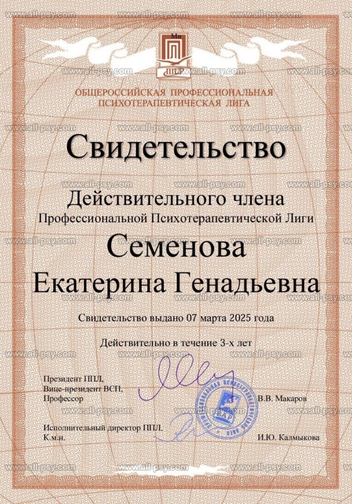 - Свидетельство Действительного члена Профессиональной Психотерапевтической Лиги