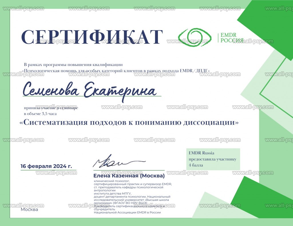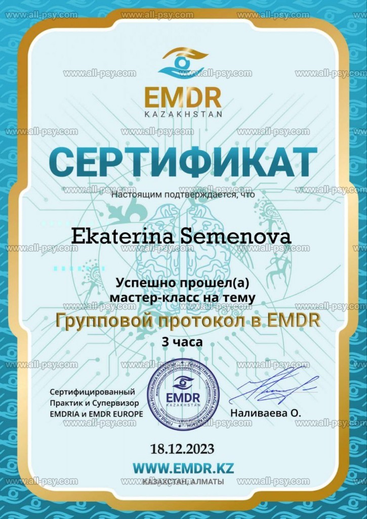 Являюсь Действительным членом Профессиональной Психотерапевтической Лиги а также Ассоциации EMDR-терапевтов.
