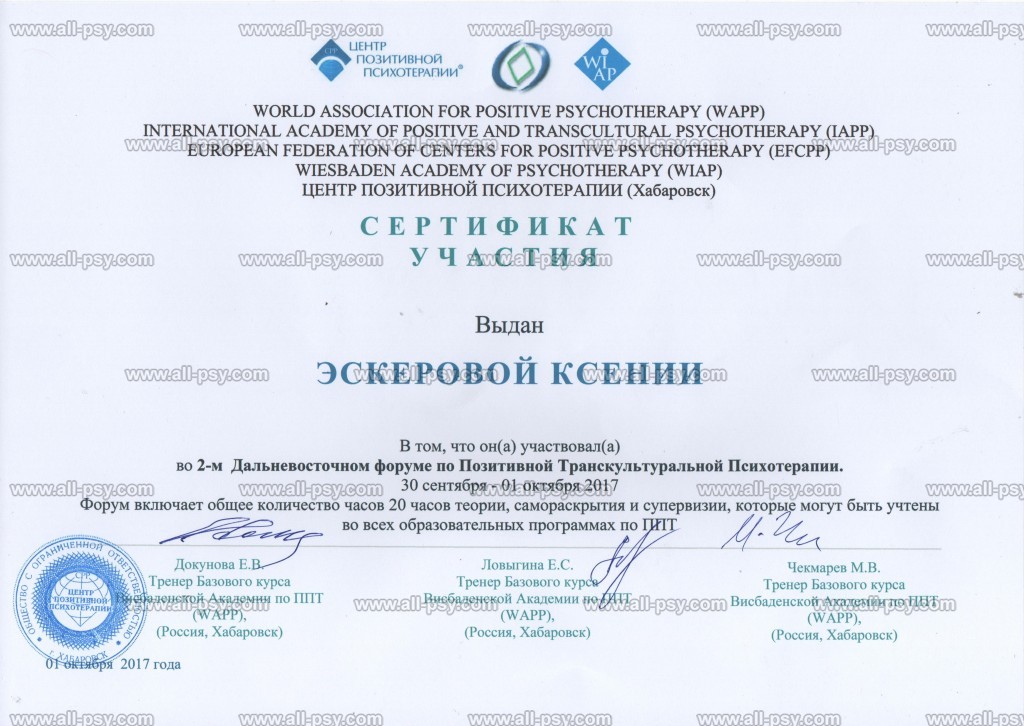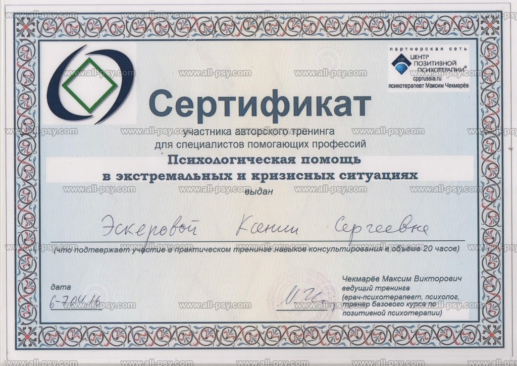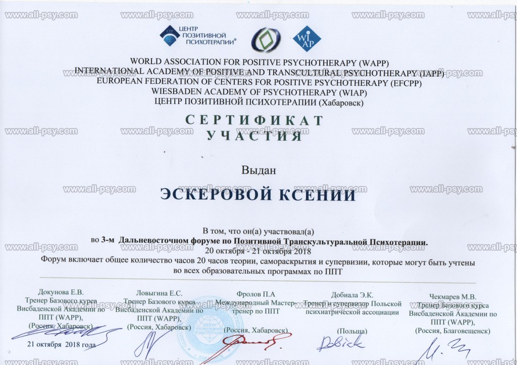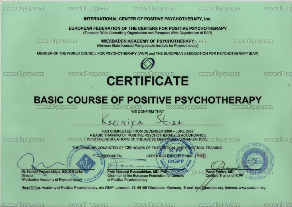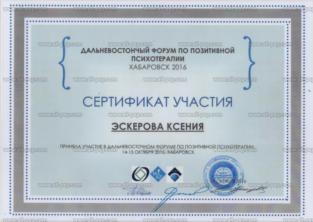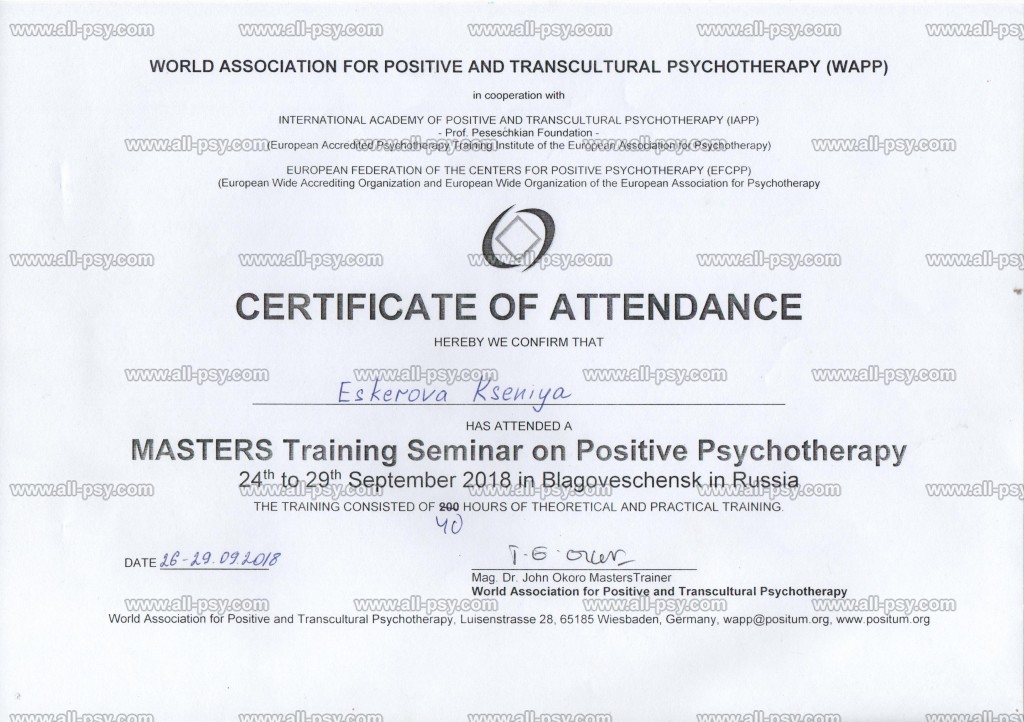 В 2019 году прошла Мастер-курс по позитивной психотерапии и продолжаю развиваться в этом направлении.