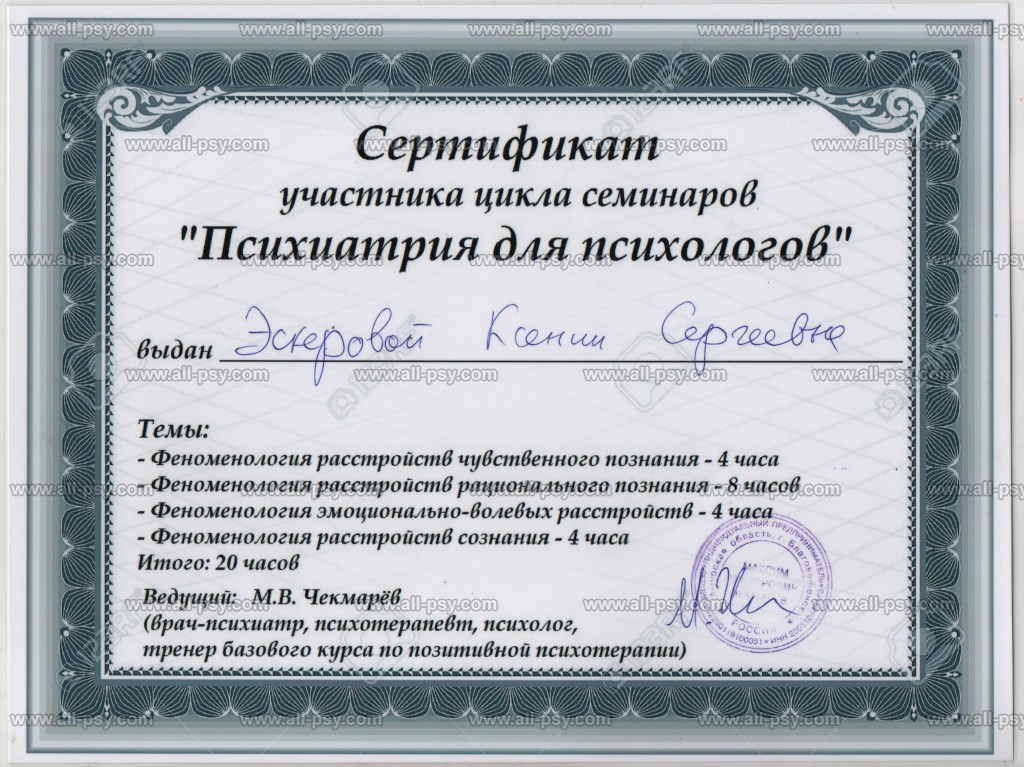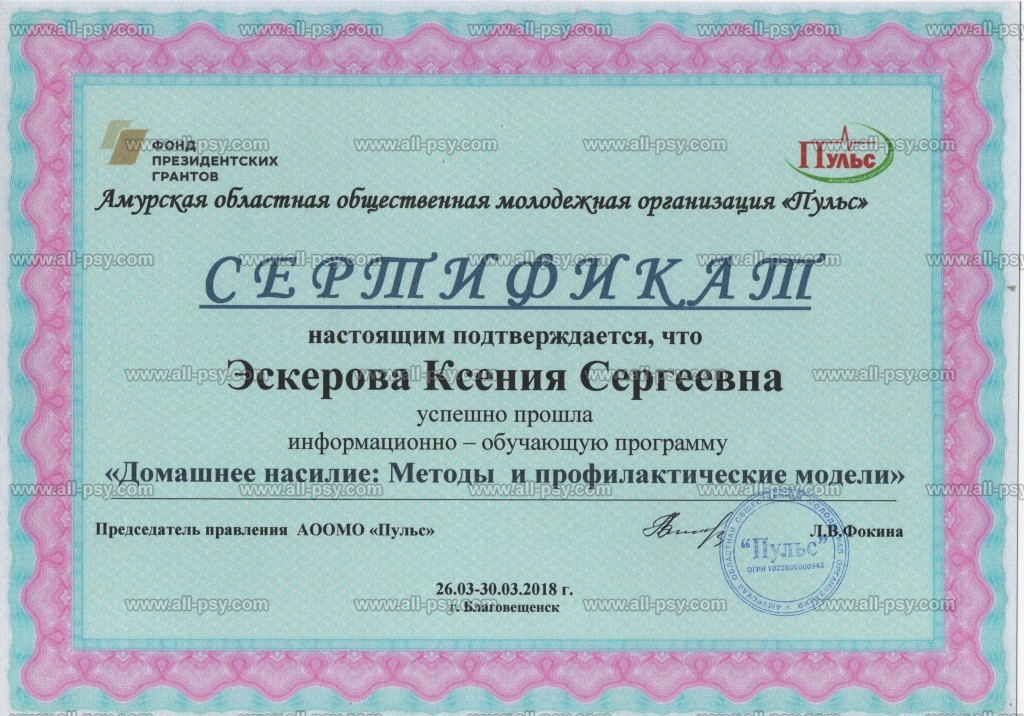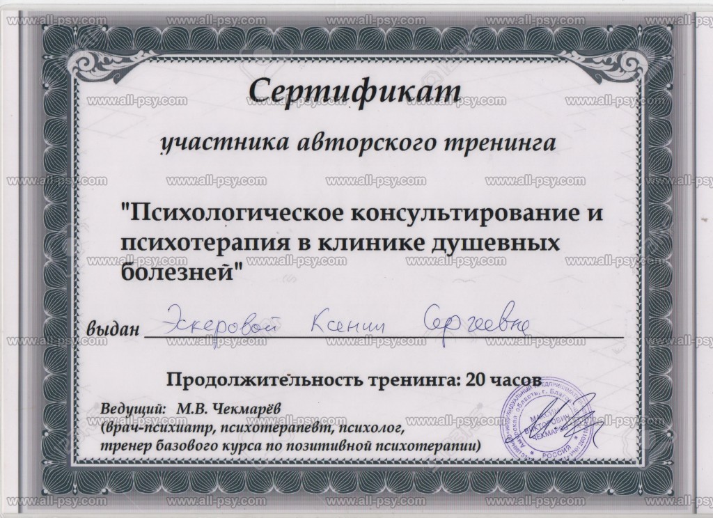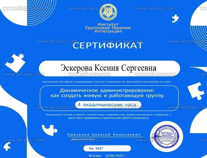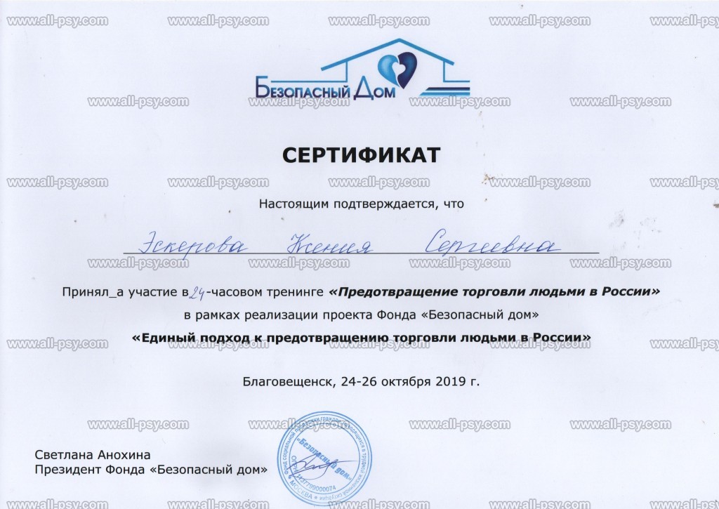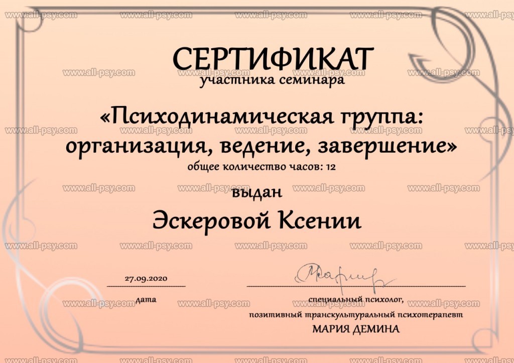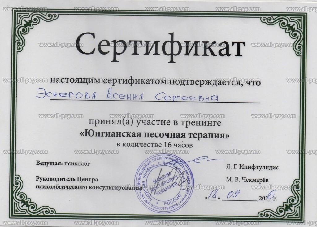 В 2019 году прошла Мастер-курс по позитивной психотерапии и продолжаю развиваться в этом направлении.
