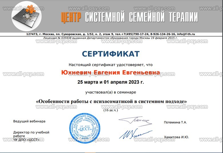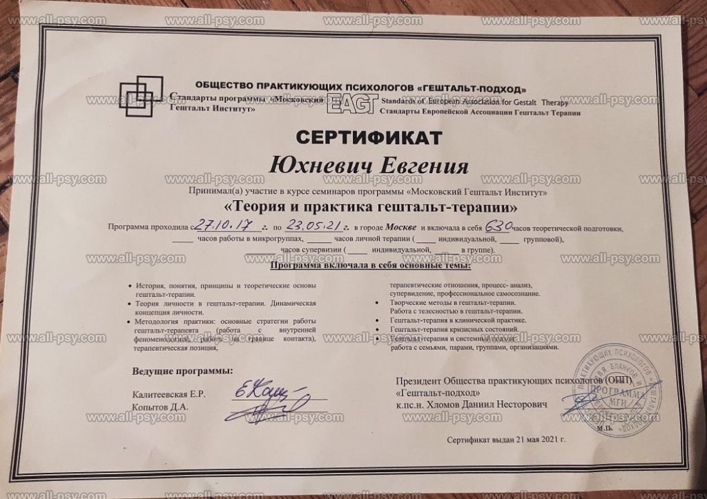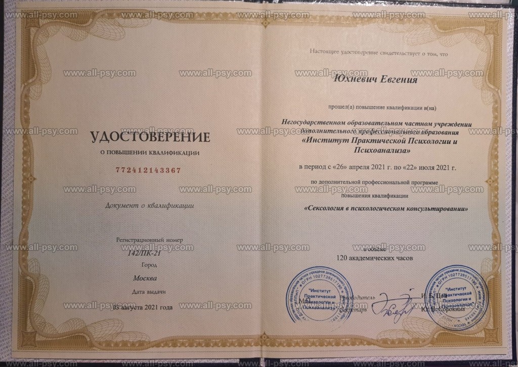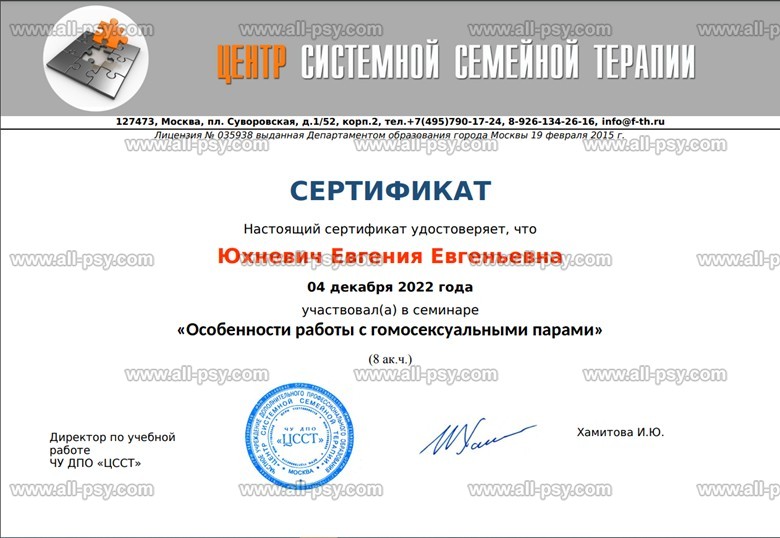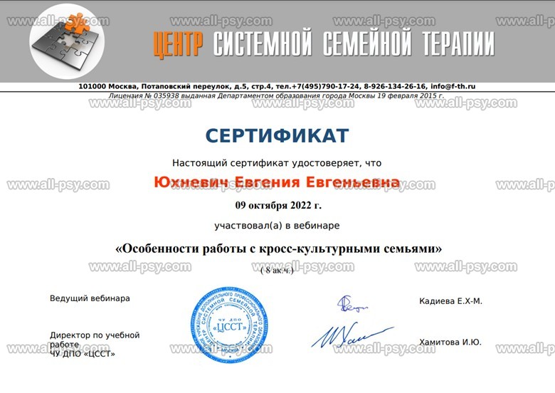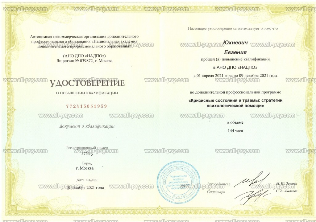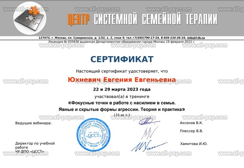 Я постоянно учусь, потому что считаю профессию психолога своим предназначением. Я продолжаю регулярно повышать квалификацию, нахожусь в долгосрочной терапии и супервизии, что является залогом моей профессиональной компетентности и этики.