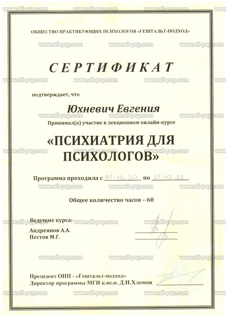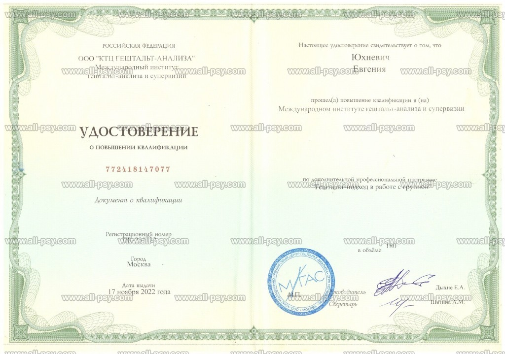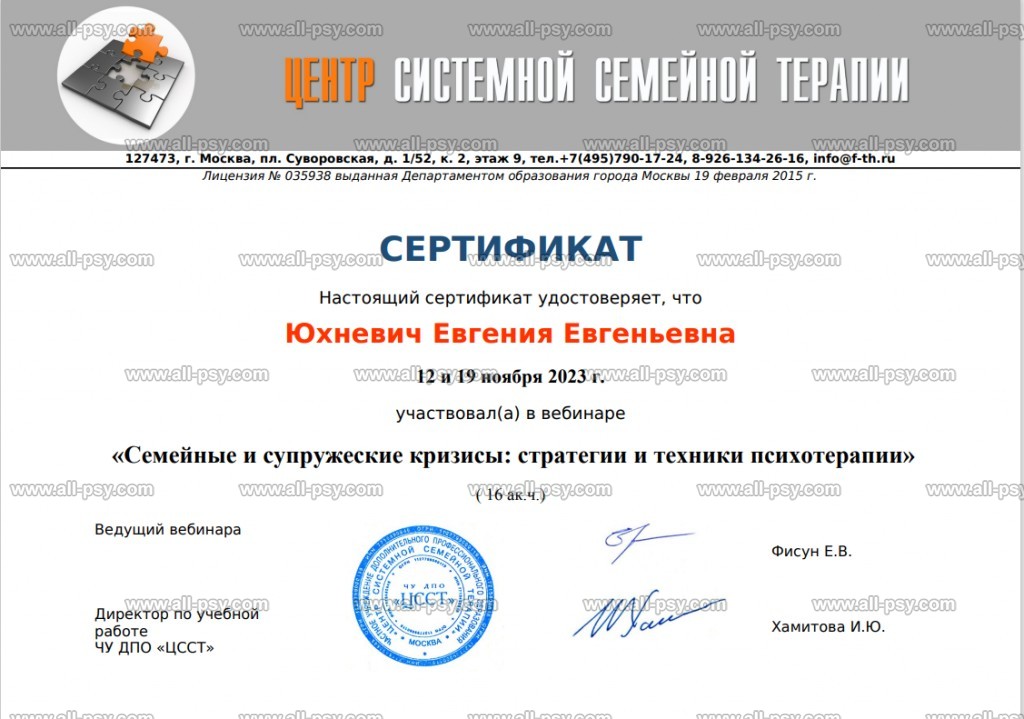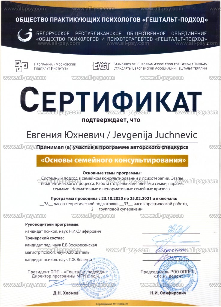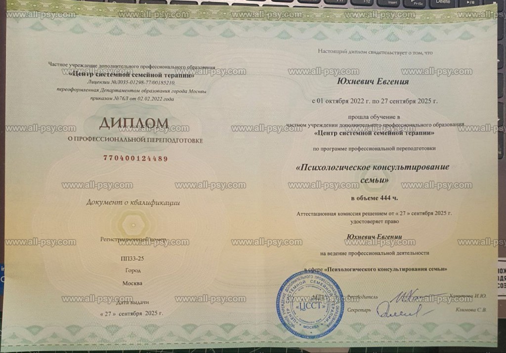 Я постоянно учусь, потому что считаю профессию психолога своим предназначением. Я продолжаю регулярно повышать квалификацию, нахожусь в долгосрочной терапии и супервизии, что является залогом моей профессиональной компетентности и этики.