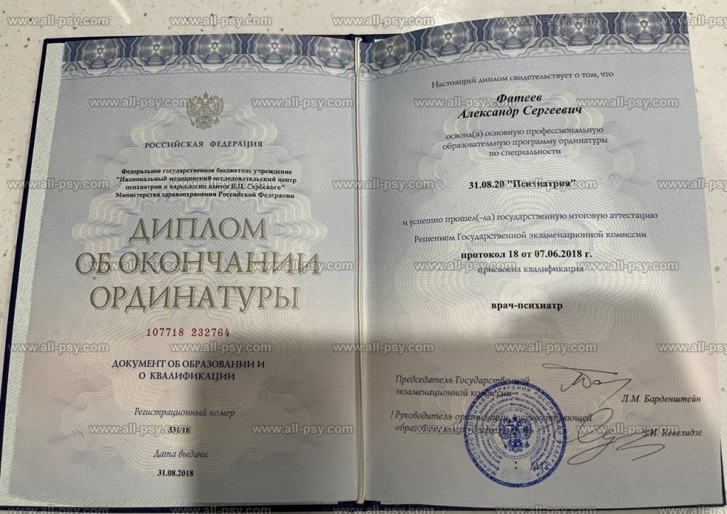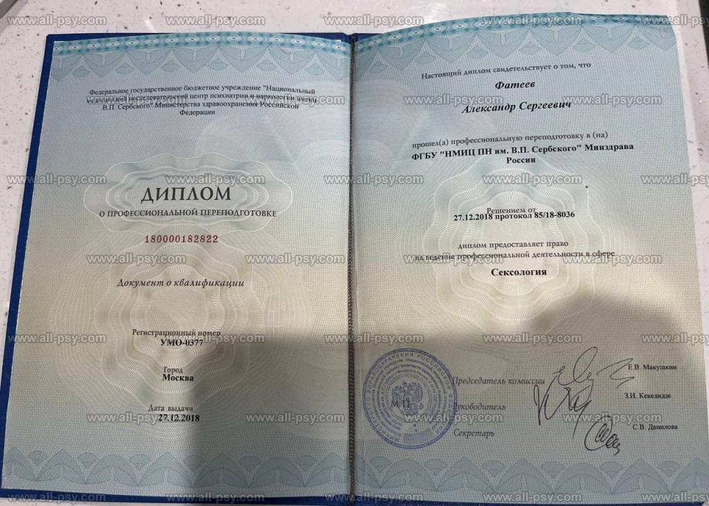 - Получил профильное медицинское образование по психиатрии, психотерапии и сексологии, с получением дипломов государственного образца.