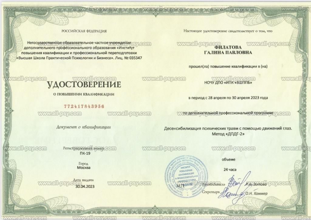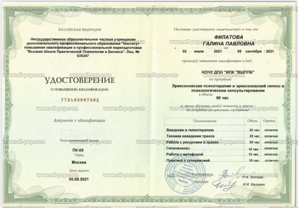 Имеются дипломы на прежнюю фамилию Филатова, поскольку они были получены до заключения брака и смены фамилии.