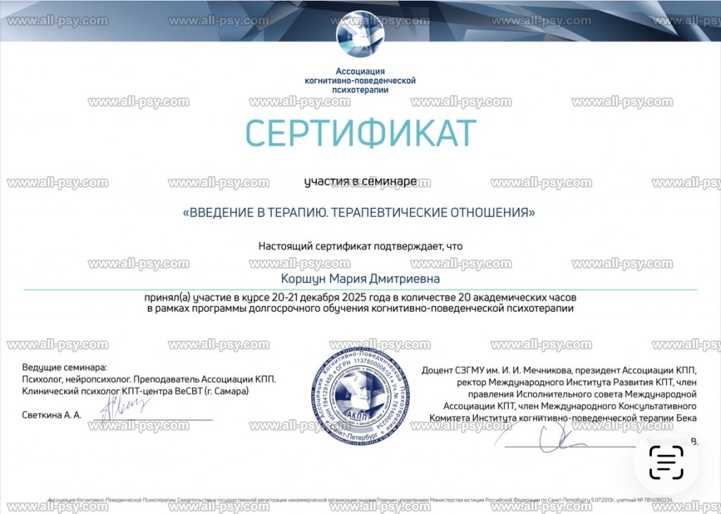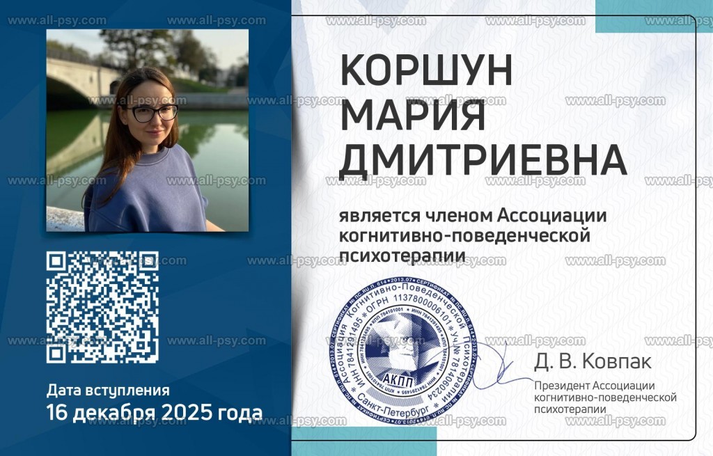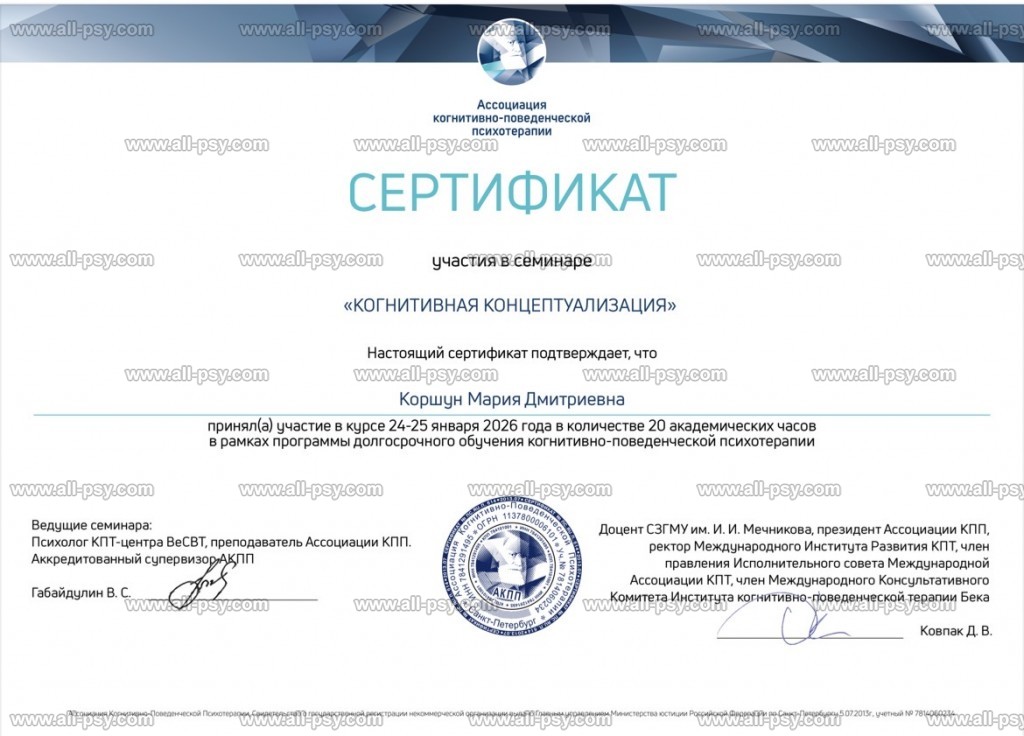 Я - психолог когнитивно-поведенческого направления (КПТ), системный семейный психолог. Я убеждена, что наше мышление во многом формирует реальность вокруг нас. Многие убеждения о себе, других людях и мире закладываются в детстве и со временем нуждаются в пересмотре.