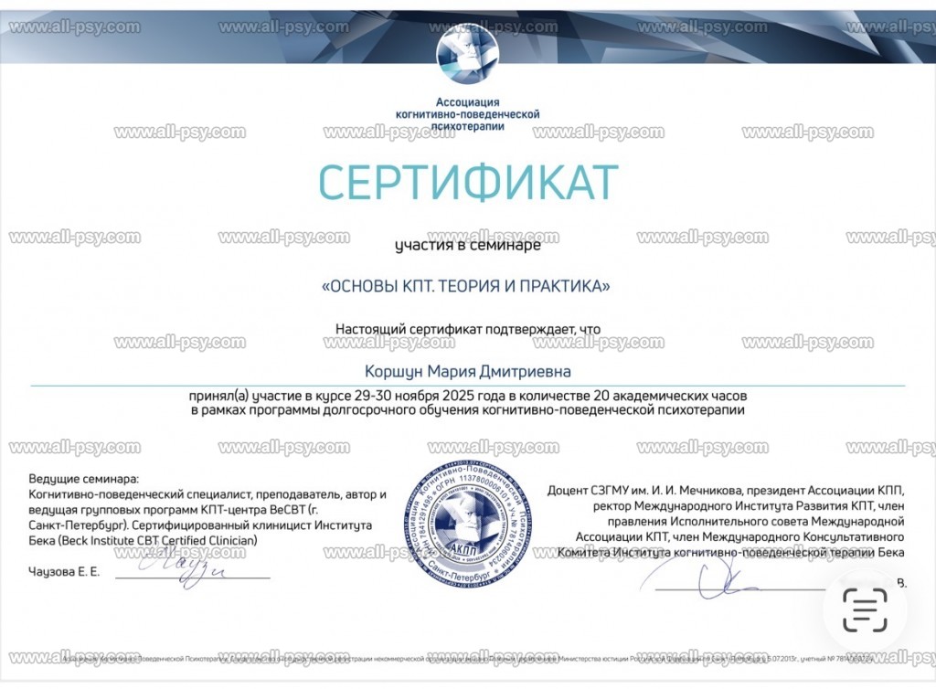 КПТ помогает выявить и изменить те мысли и установки, которые мешают вам жить полной жизнью. Этот подход позволяет справиться со множеством сложностей и выйти на качественно новый уровень.