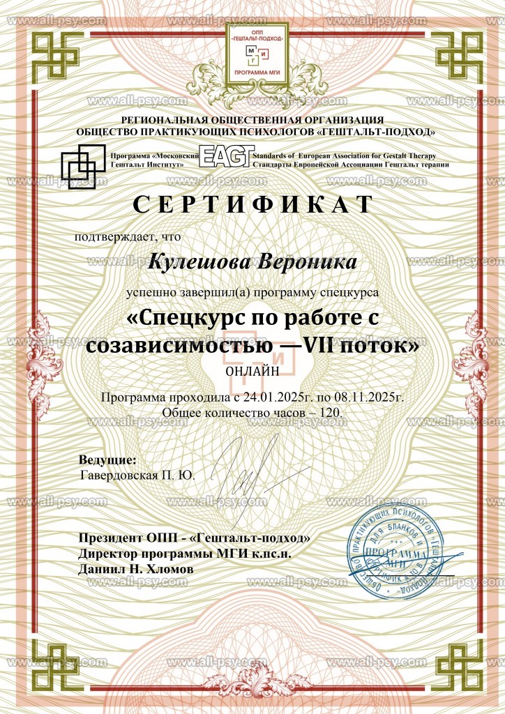 Регулярно повышаю свою квалификацию: посещаю супервизию (личную и групповую), интервизию, прохожу обучающие программы, участвую в конференциях и психологических интенсивах.