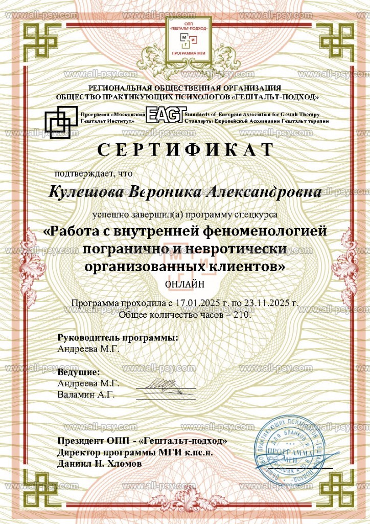 - обучение гештальт-терапии в Московском Гештальт Институте (1 и 2 ступень),