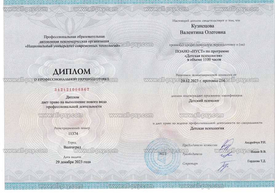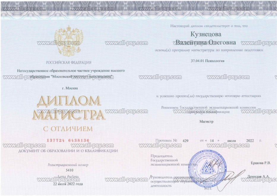 Закончила с отличием магистратуру по направленности образовательной программы: семейное консультирование и психотерапия, повышала квалификацию и дополнительно работаю в подходах: Когнитивно-поведенческая психотерапия, Эмоционально-фокусированная терапия (семейная терапия), Транзактный анализ, Арт-терапия (имеются документы о повышении квалификации и профессиональной переподготовке). Постоянно совершенствую свои знания, повышаю квалификацию в выбранных направлениях.