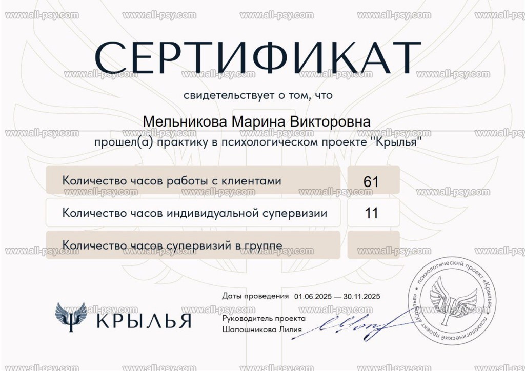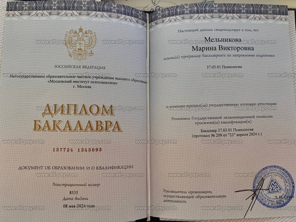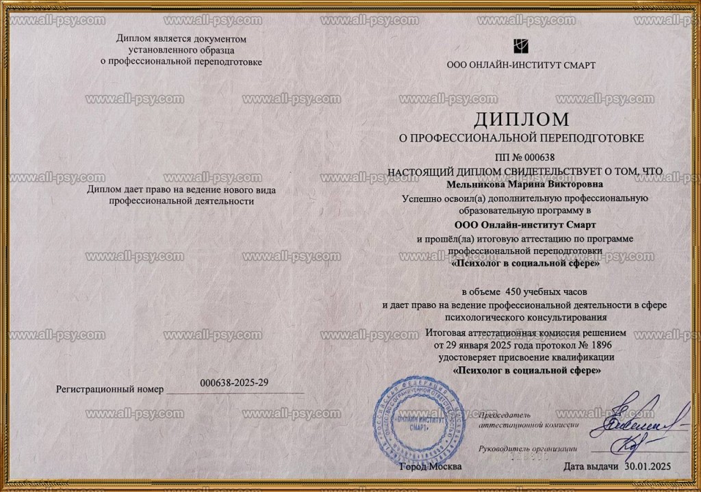 * высшее психологическое образование + профессиональная переподготовка: моё образование позволяет мне грамотно подходить к каждому случаю;
