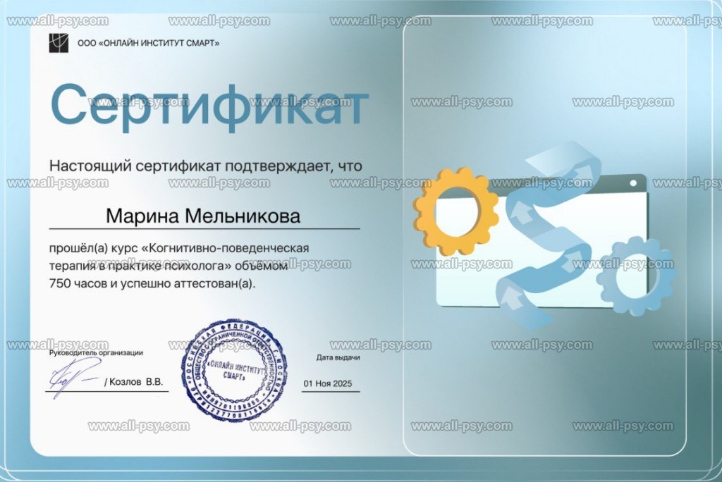 Я являюсь практикующим психологом с высшим психологическим образованием и профессиональной переподготовкой по методу КПТ. Также являюсь членом ассоциации когнитивно-поведенческой терапии (АКПП).