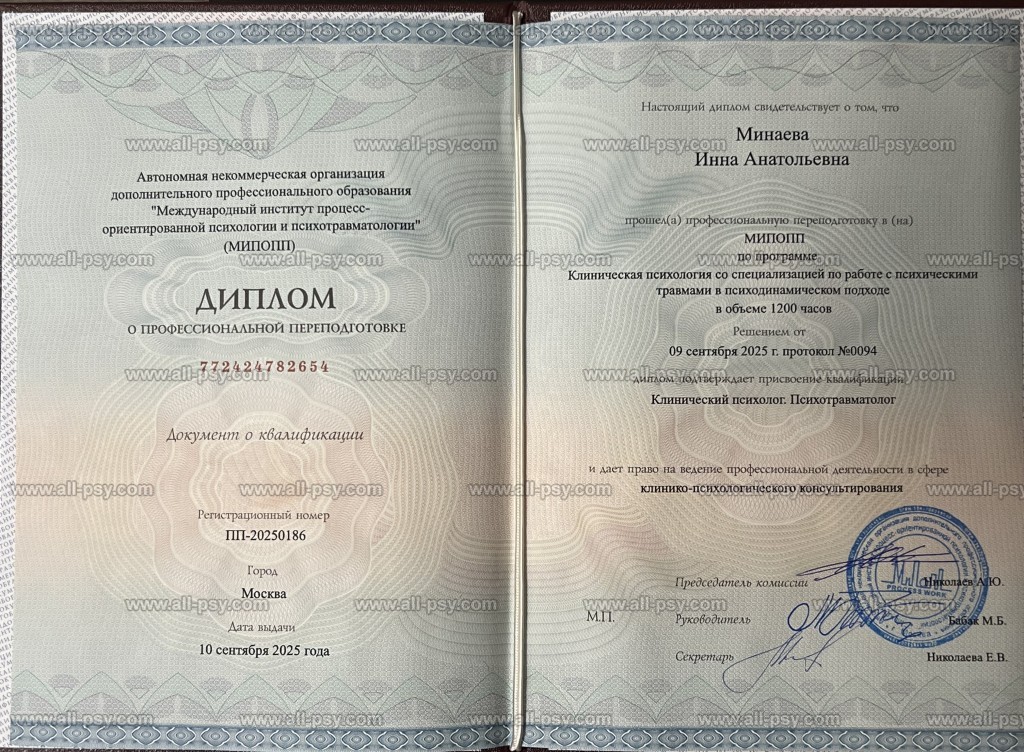 МИПОПП (2023–2025) — клинический психолог, процесс-ориентированная терапия (Process Work) специализация — работа с психическими травмами в психодинамическом подходе
