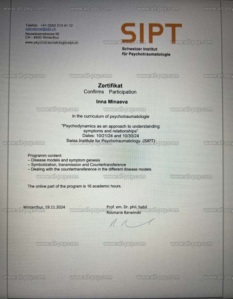 МИПОПП (2024) — сертификат Швейцарского института психотравматологии SIPT «Психодинамика как подход к пониманию симптомов и терапевтических отношений»