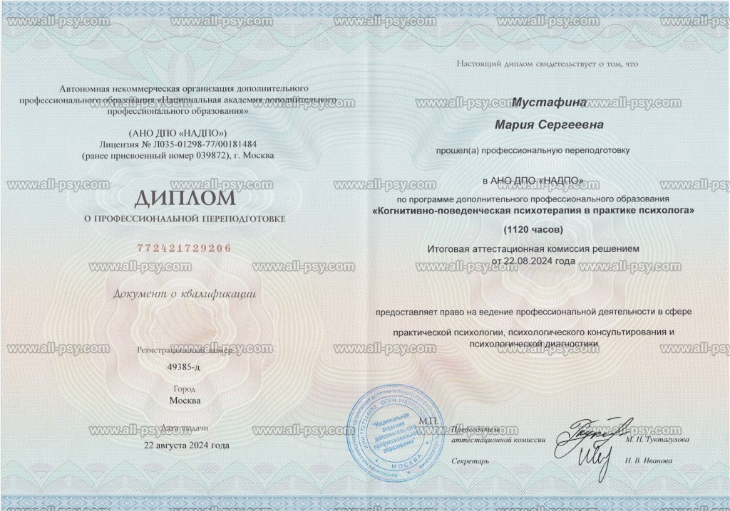 Меня зовут Мария, я психолог, специализирующийся на методах когнитивно-поведенческой терапии (КПТ). Если вы чувствуете, что тревожные мысли, страхи или внутренние противоречия мешают вам двигаться вперед, я готова помочь вам найти выход. Моя главная цель — создать для вас теплую и доверительную атмосферу, где вы сможете открыто говорить о своих переживаниях и начать путь к позитивным переменам.