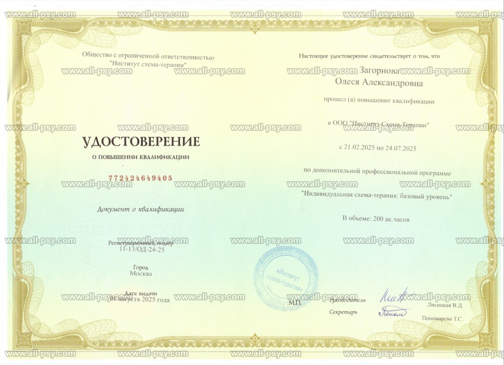 Работаю в научно-доказанных подходах: когнитивно-поведенческая терапия, схема-терапия, коучинг. Постоянно прохожу супервизии и интервизии для повышения своего профессионализма.