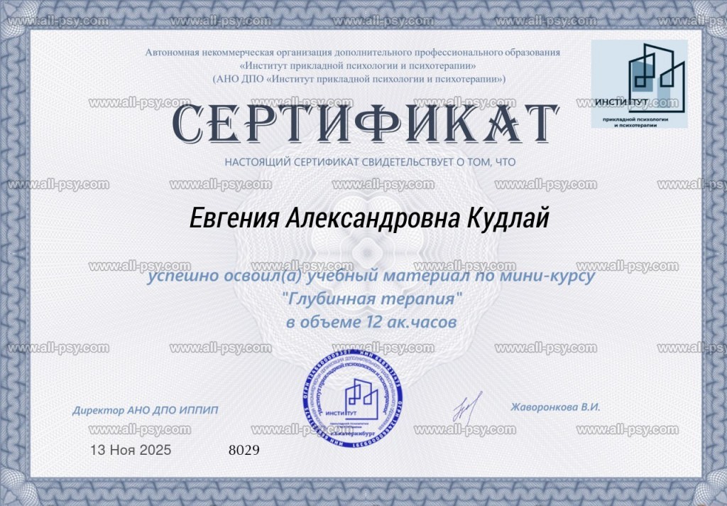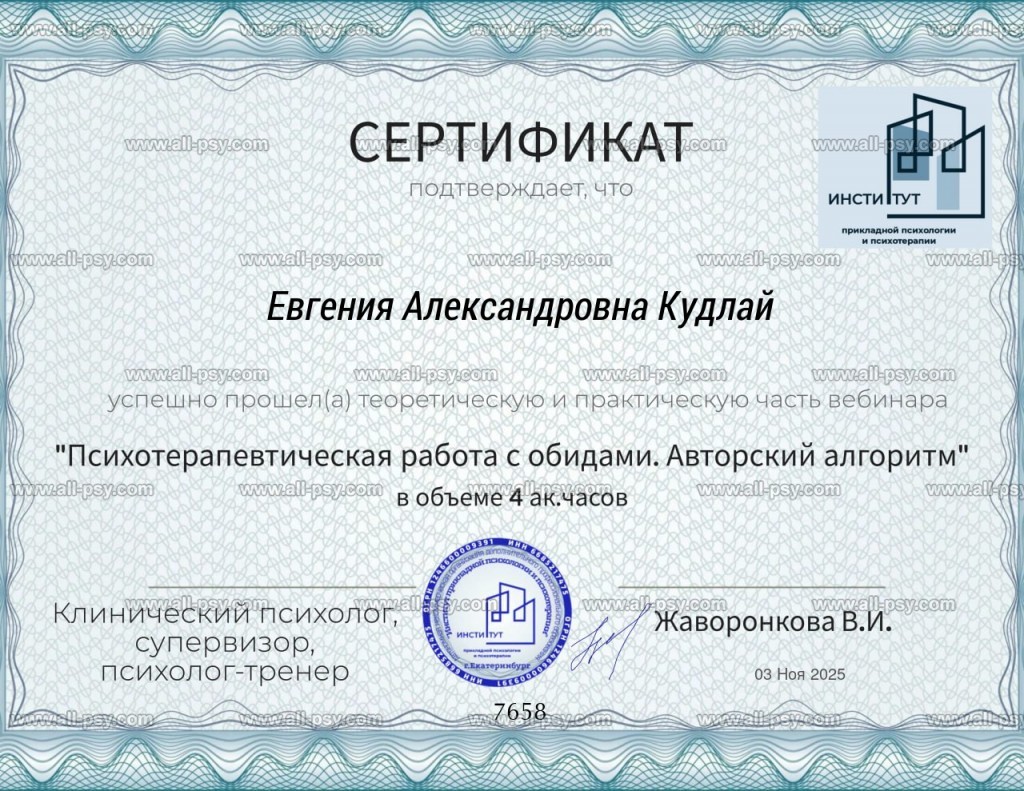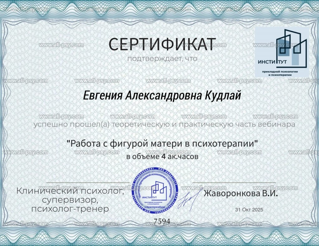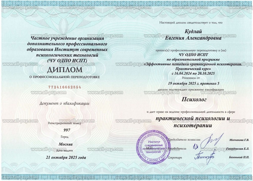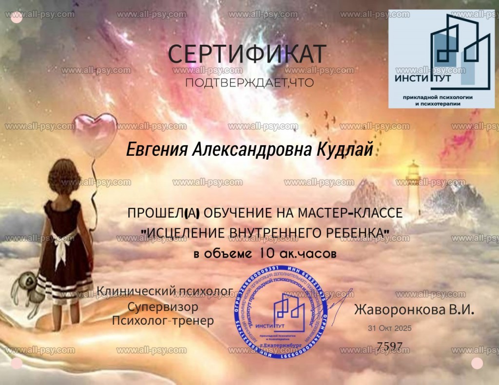 Здравствуйте! Меня зовут Евгения Кудлай, я профессиональный психолог. Специализируюсь на интегративном подходе, где сочетаю глубинную терапию (работу с детскими травмами, непройденной сепарацией, обидами и т.д.) и эффективные краткосрочные методы современной психологии.