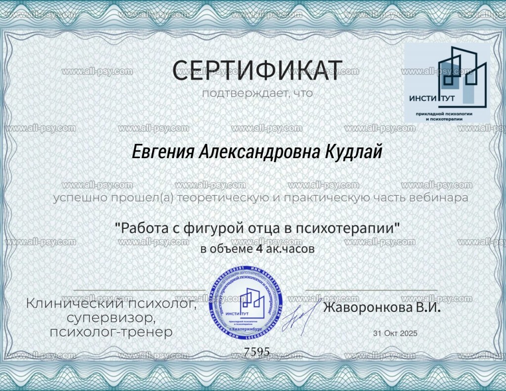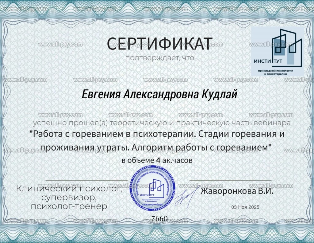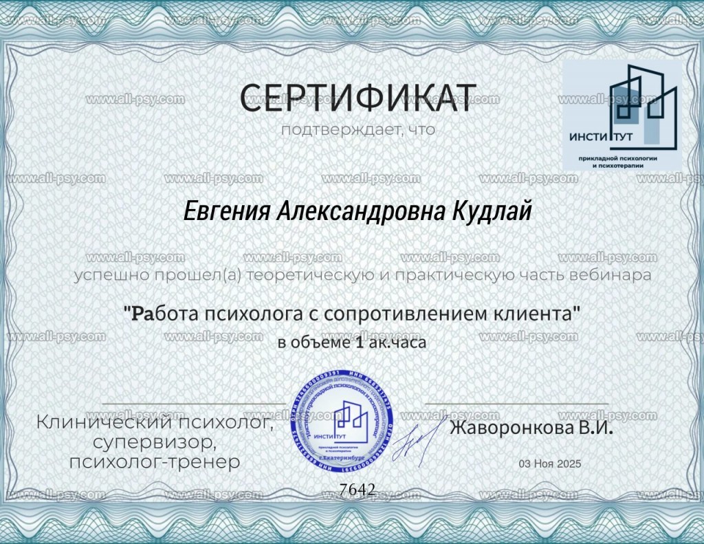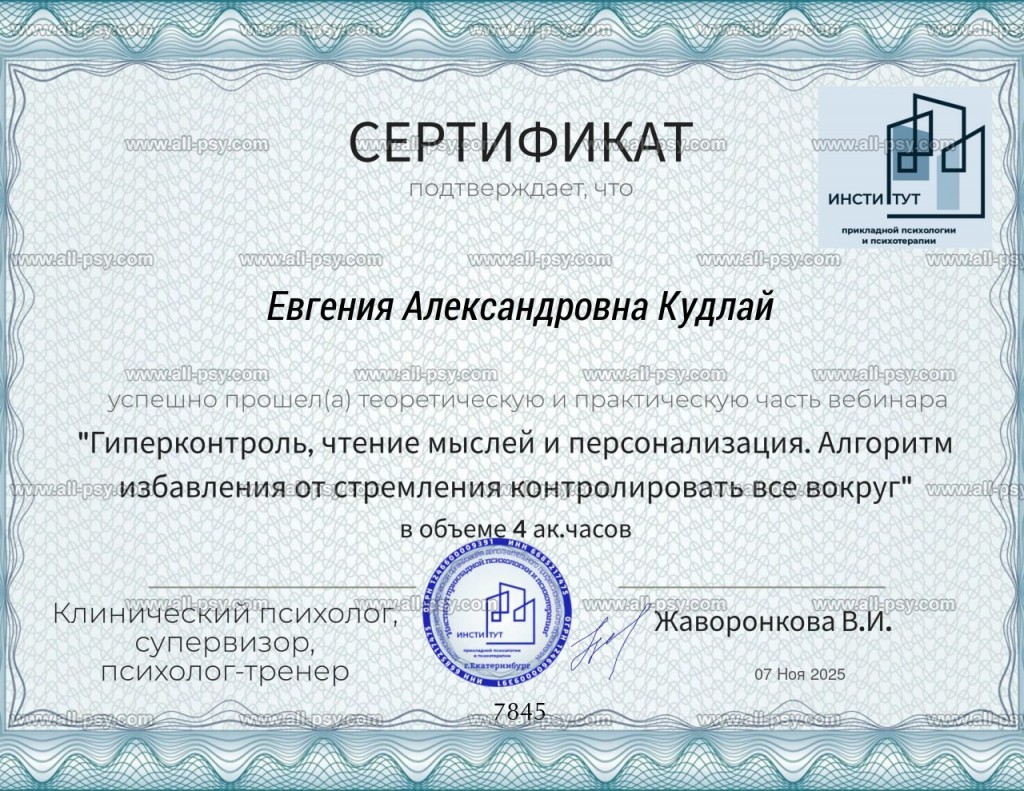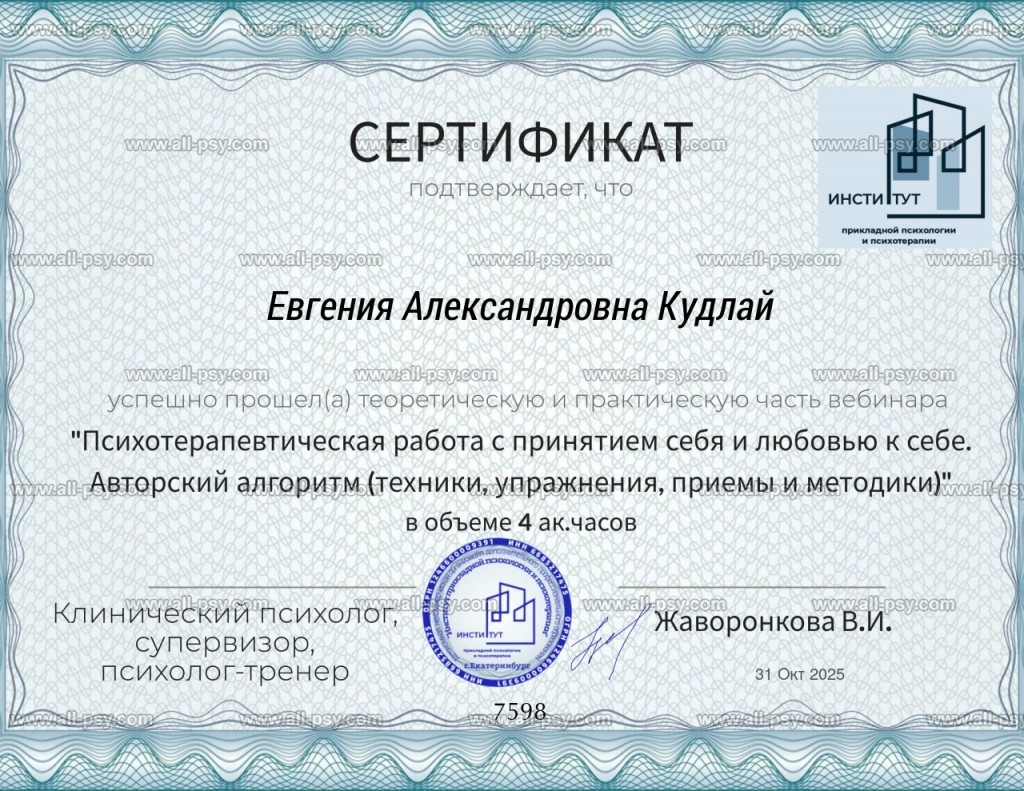 Здравствуйте! Меня зовут Евгения Кудлай, я профессиональный психолог. Специализируюсь на интегративном подходе, где сочетаю глубинную терапию (работу с детскими травмами, непройденной сепарацией, обидами и т.д.) и эффективные краткосрочные методы современной психологии.