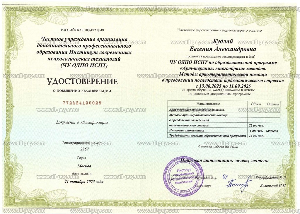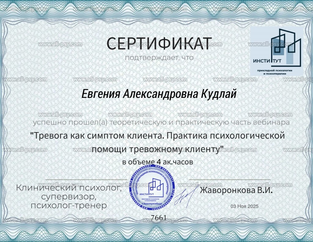 Постоянно повышаю квалификацию и участвую в профессиональных обучающих программах, прохожу еженедельную личную терапию, супервизии и интервизии.