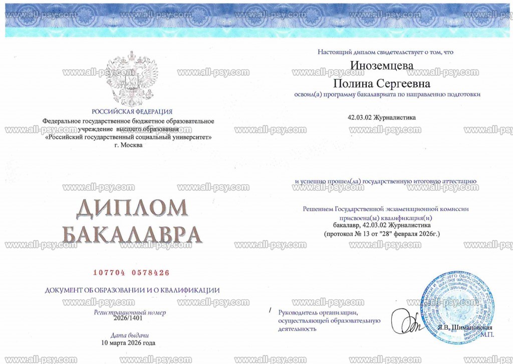 Я получила высшее образование в Российском государственном социальном университете (РГСУ, г. Москва), а также дополнительное профессиональное образование на Портале психологов и психотерапевтов, где проходила обучение и практическую подготовку в сфере психологического консультирования.