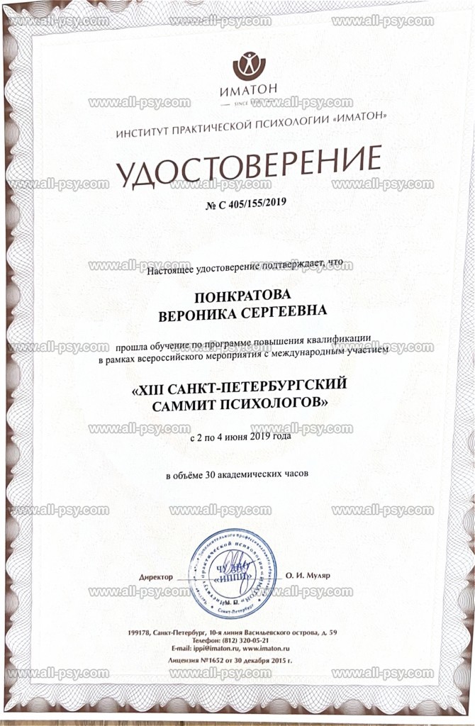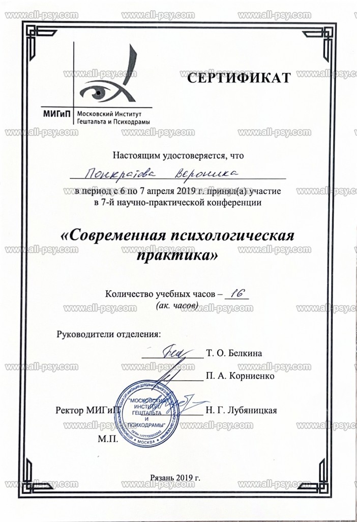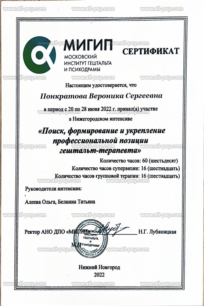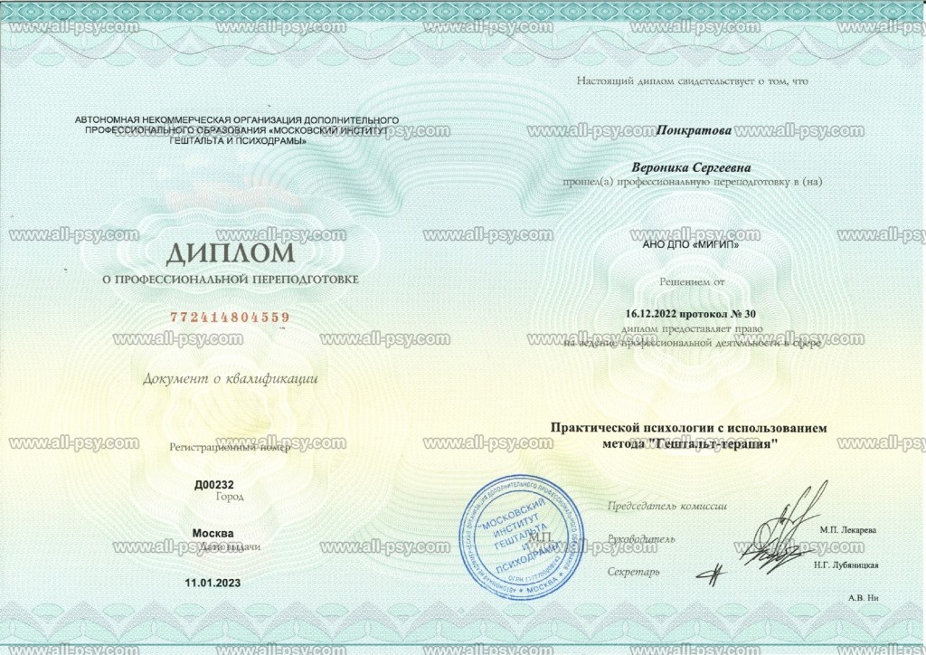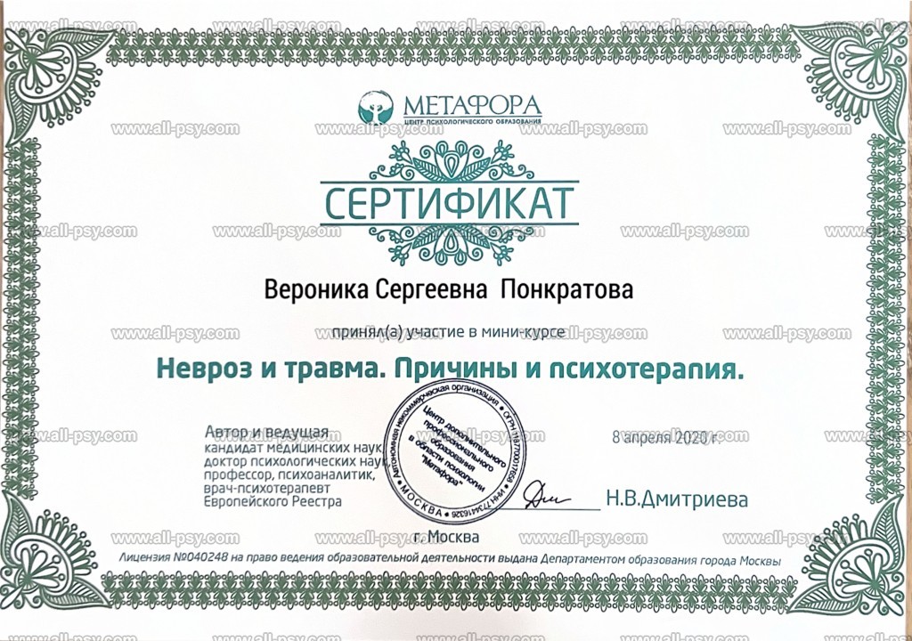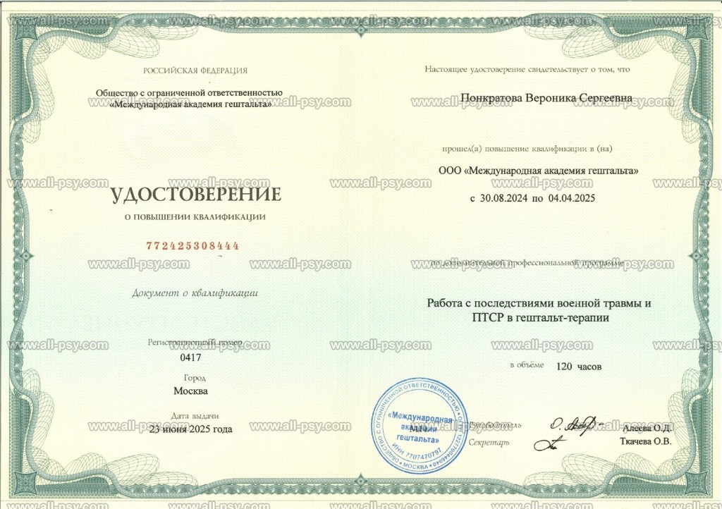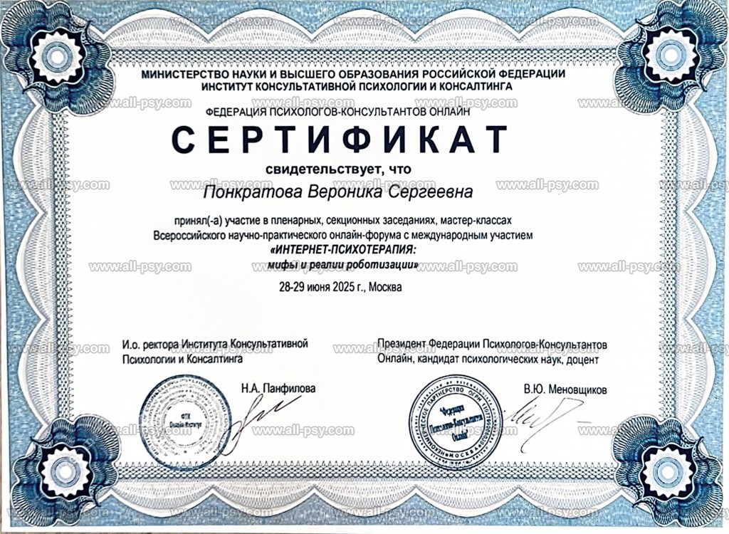 Здравствуйте, меня зовут Вероника. Я являюсь практикующим психологом, сертифицированным гештальт-терапевтом, специалистом по работе с последствиями военной травмы и ПТСР, преподавателем, действительным членом Российского психологического общества (РПО). Регулярно посещаю личную терапию и супервизию.