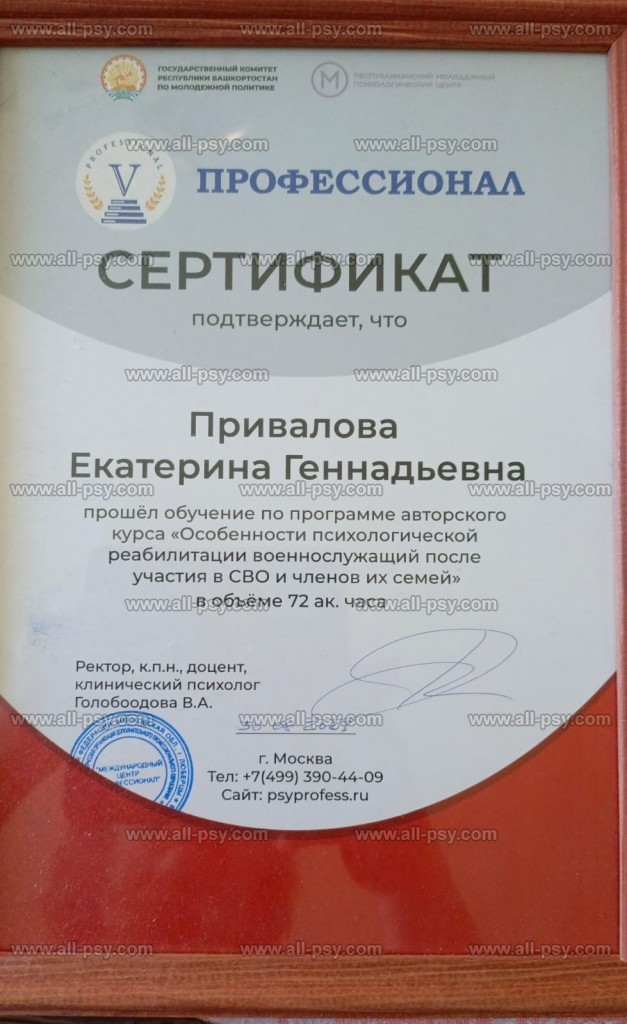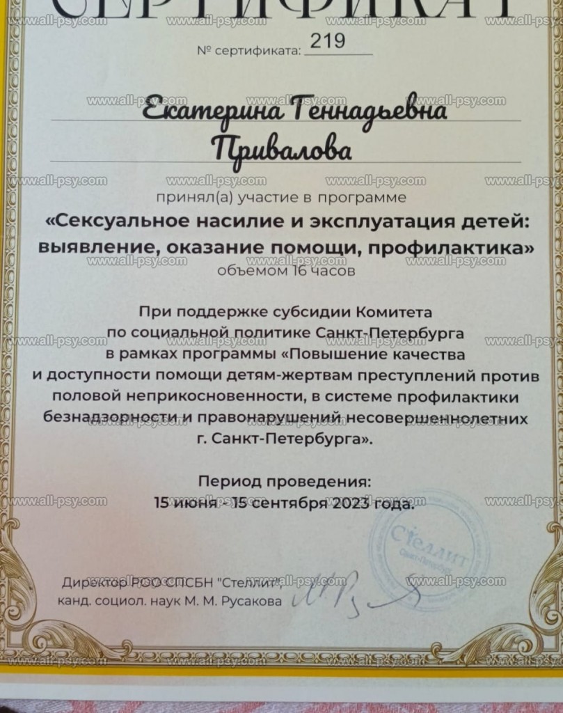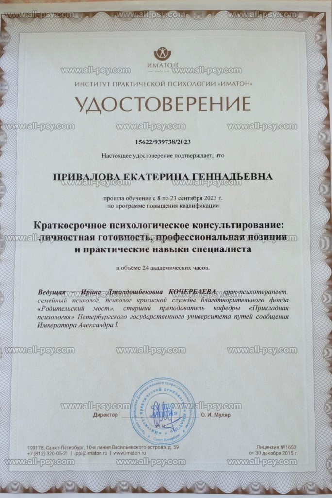 Я активно развиваюсь в своей профессиональной области, регулярно прохожу повышение квалификации и посещаю семинары, тренинги и конференции, чтобы быть в курсе последних достижений в психологии.