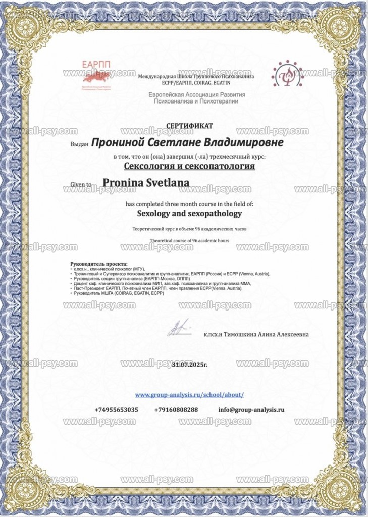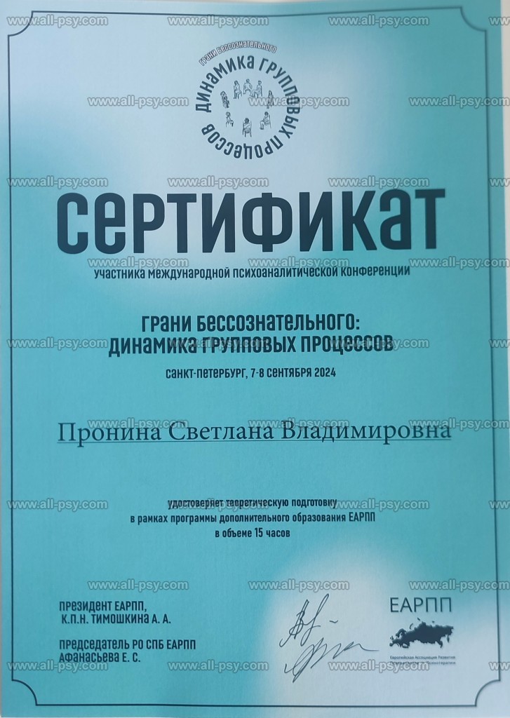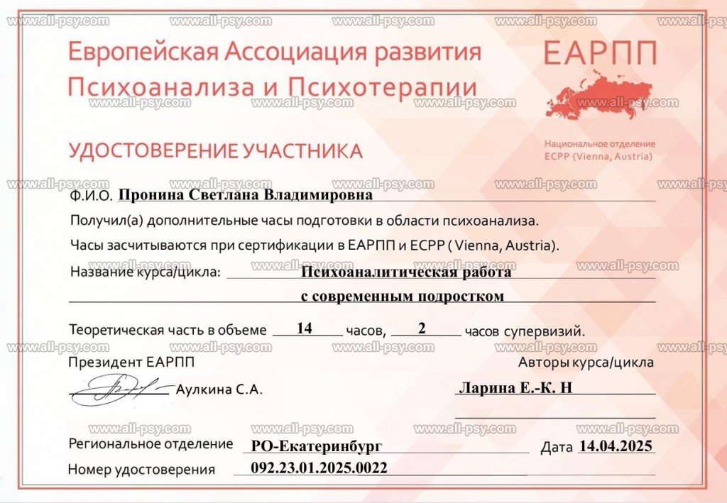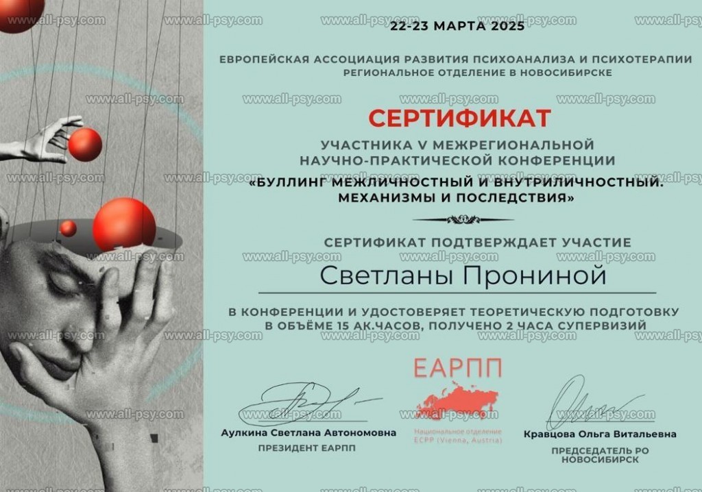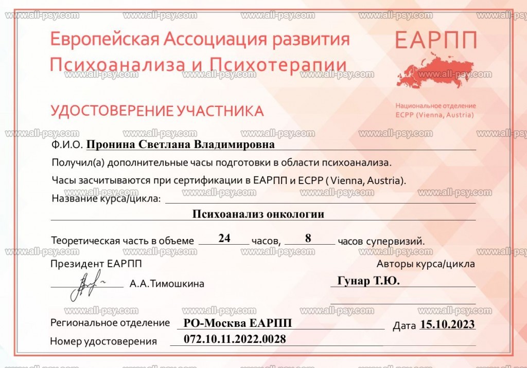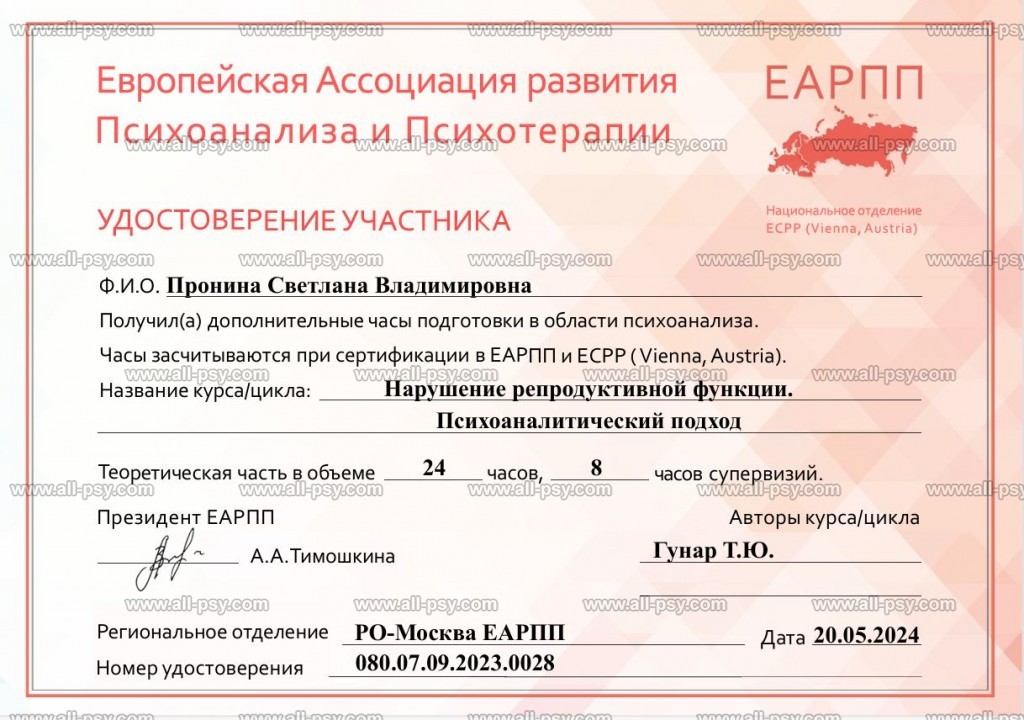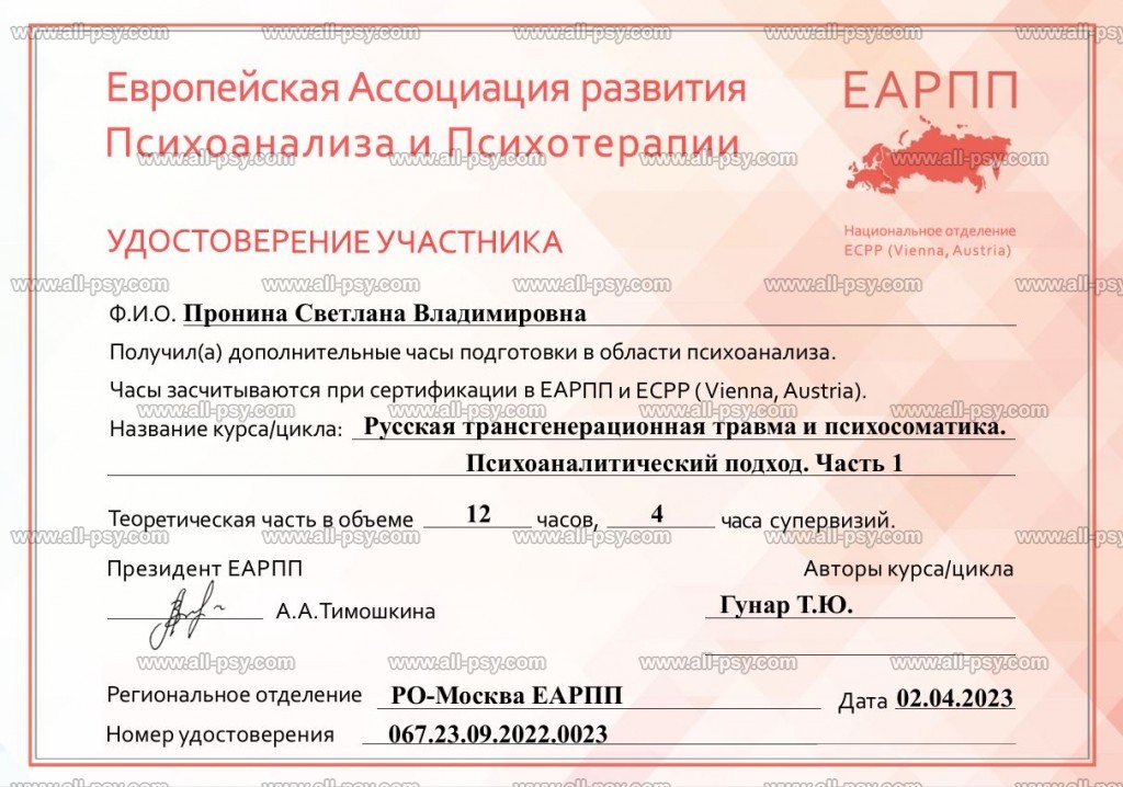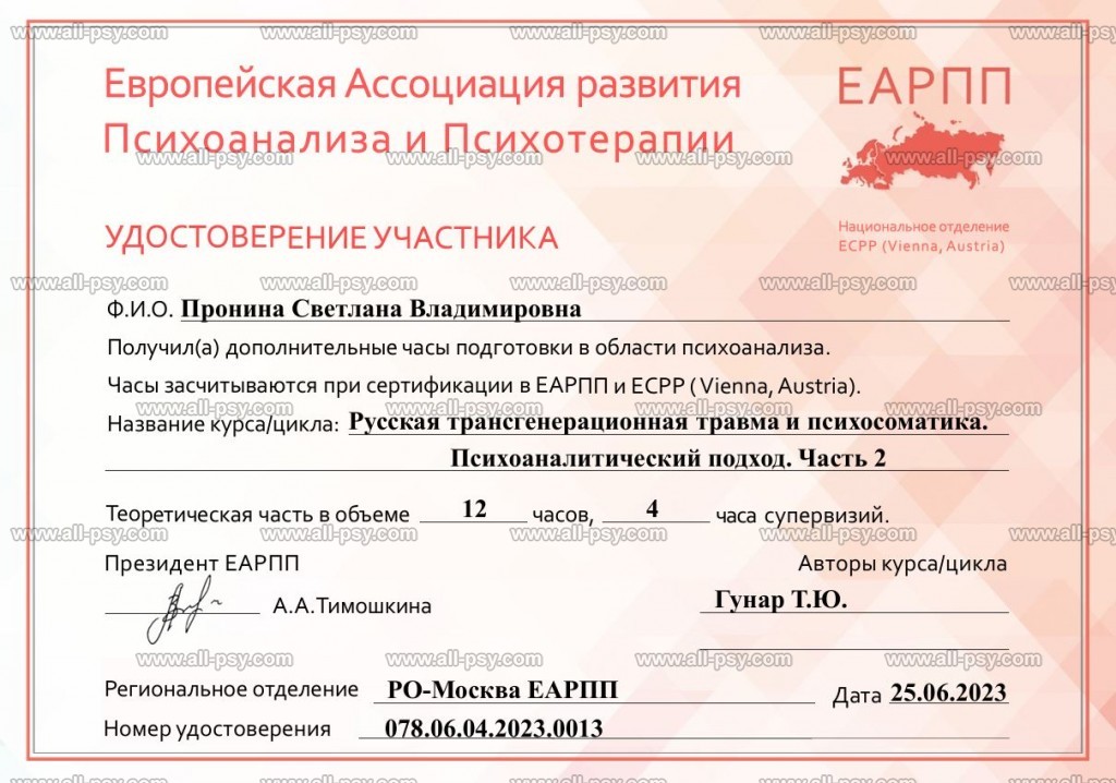 Являюсь членом Европейской Ассоциации развития психоанализа и психотерапии (ЕАРПП), национальное отделение ЕСРР (Vienna, Austria) в РФ.