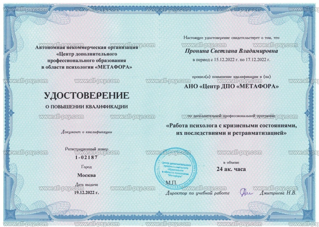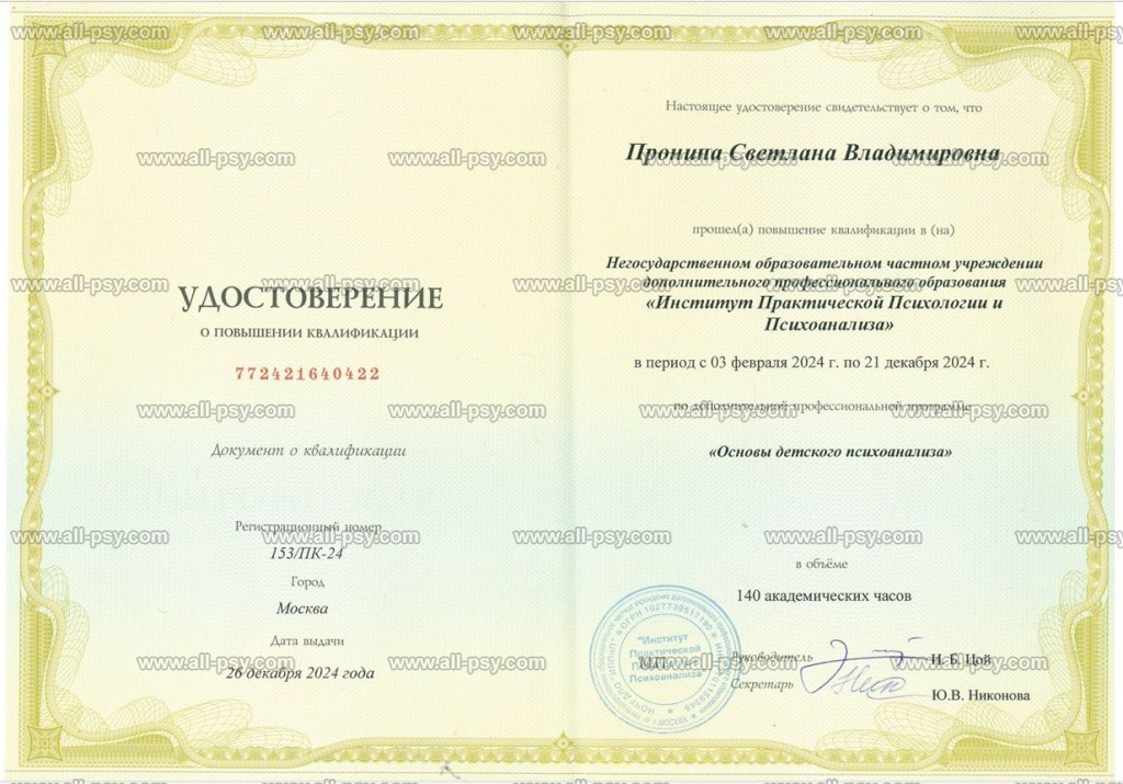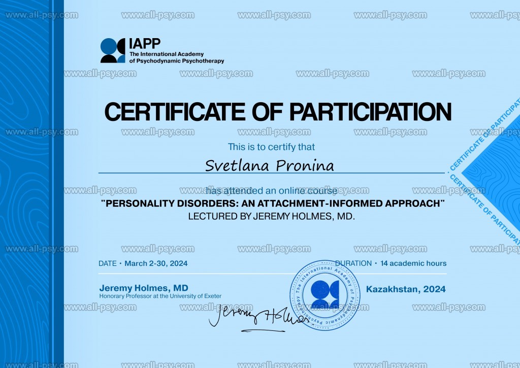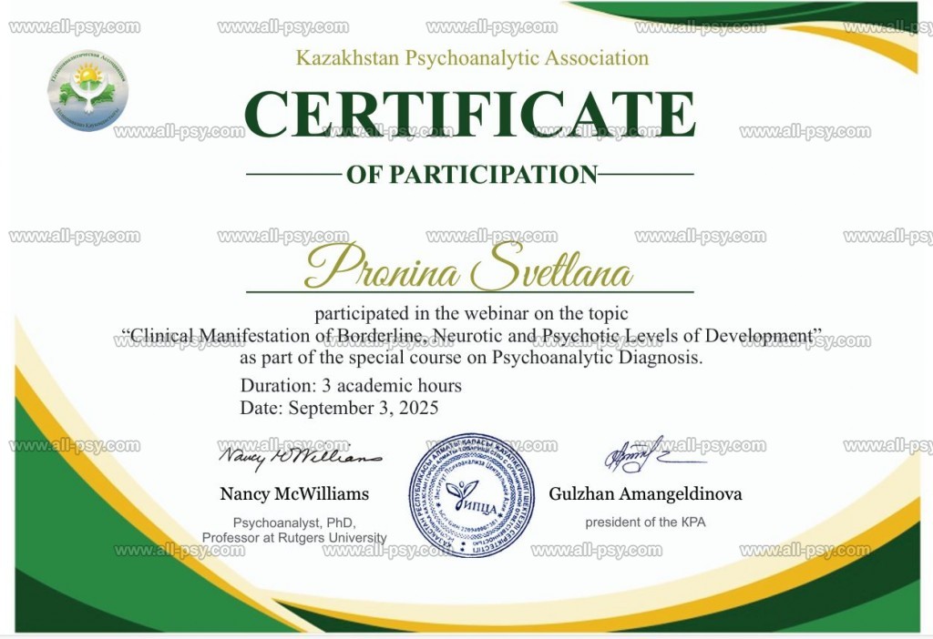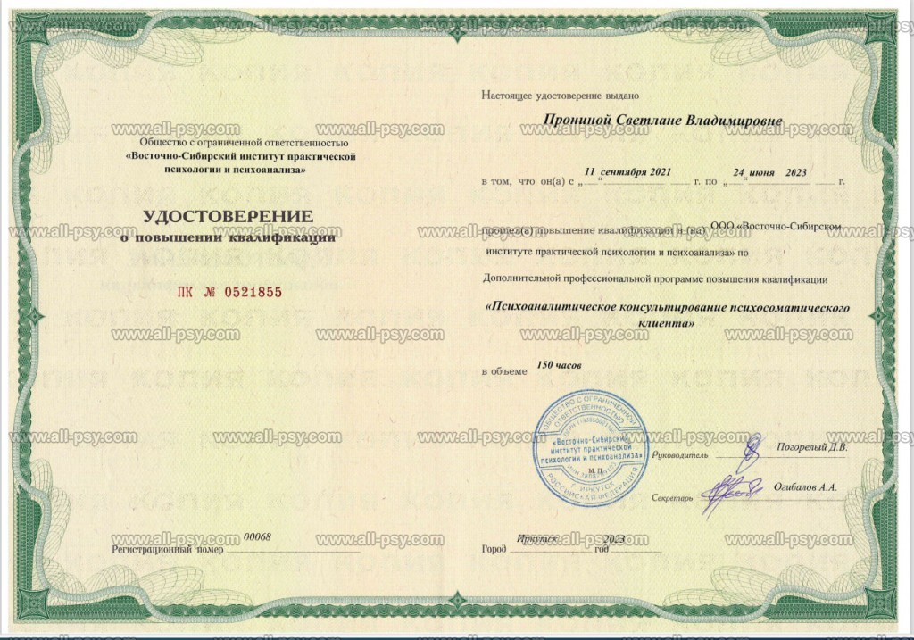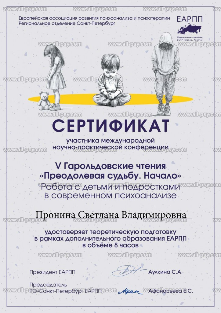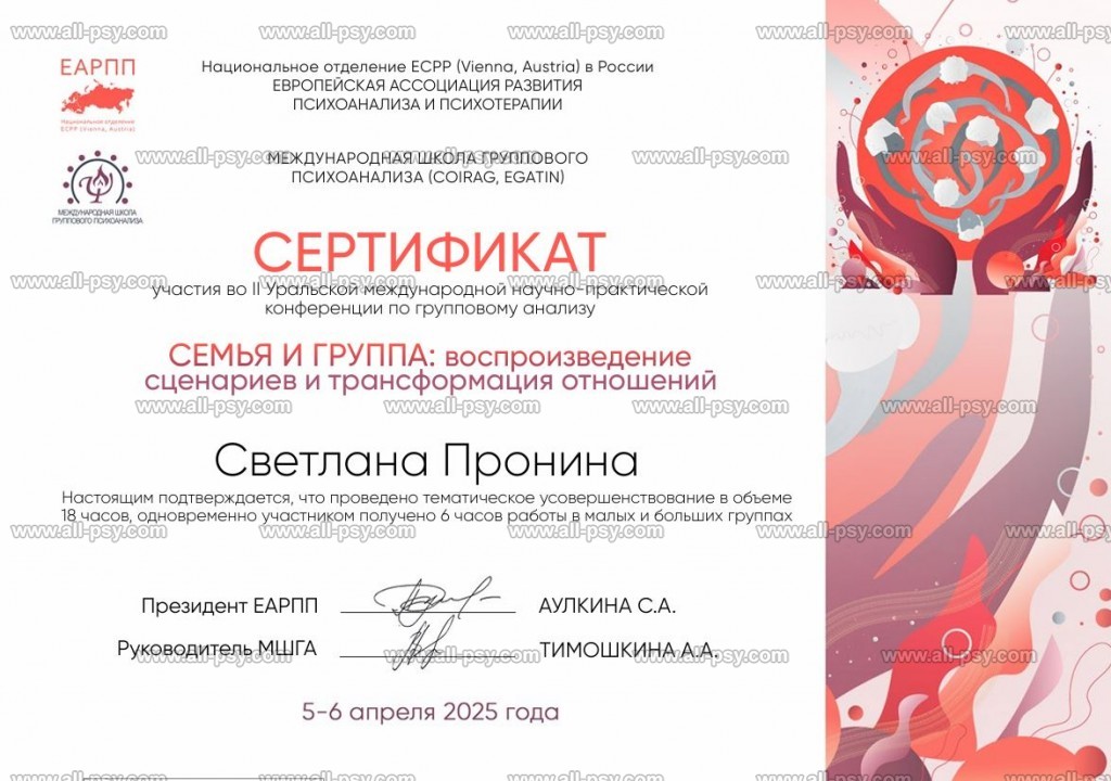 Являюсь членом Европейской Ассоциации развития психоанализа и психотерапии (ЕАРПП), национальное отделение ЕСРР (Vienna, Austria) в РФ.