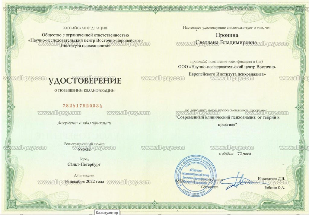 Личная психотерапия в психоаналитическом подходе (групповая и индивидуальная) - более 700 часов.
