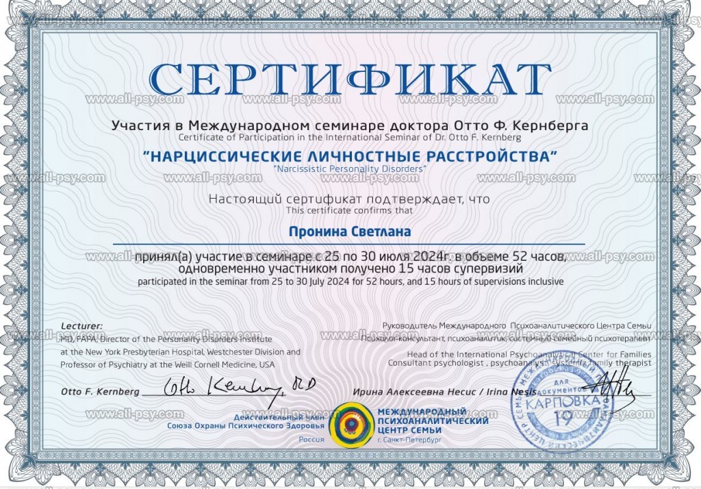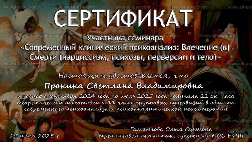 Супервизии — прошла более 400 индивидуальных и групповых супервизий.