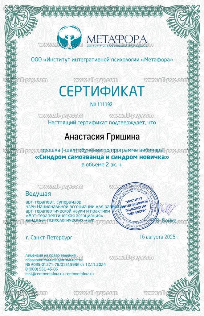 Состою в ассоциациях СОТА (Санкт-Петербургская ассоциация транзактного анализа) и АКПП (Ассоциация когнитивно-поведенческой психотерапии).