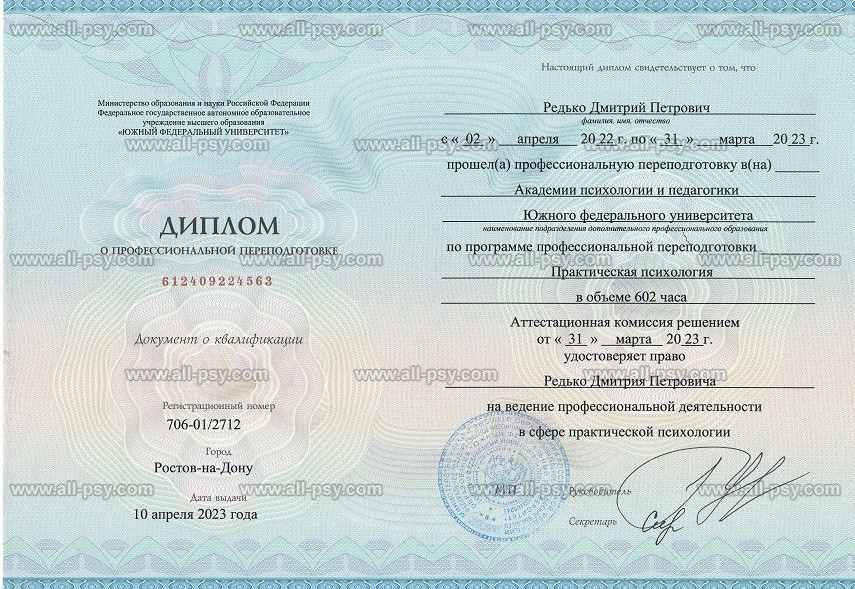 Меня зовут Редько Дмитрий, мне 54 года, я психолог, психоаналитик. Имею высшее психологическое и психоаналитическое образование и опыт психологического консультирования более 1 года. Работаю в психоаналитическом и интегративном подходах. Регулярно прохожу личную психотерапию и супервизии у более опытных коллег. Буду рад встрече с Вами и совместной работе над Вашим запросом.