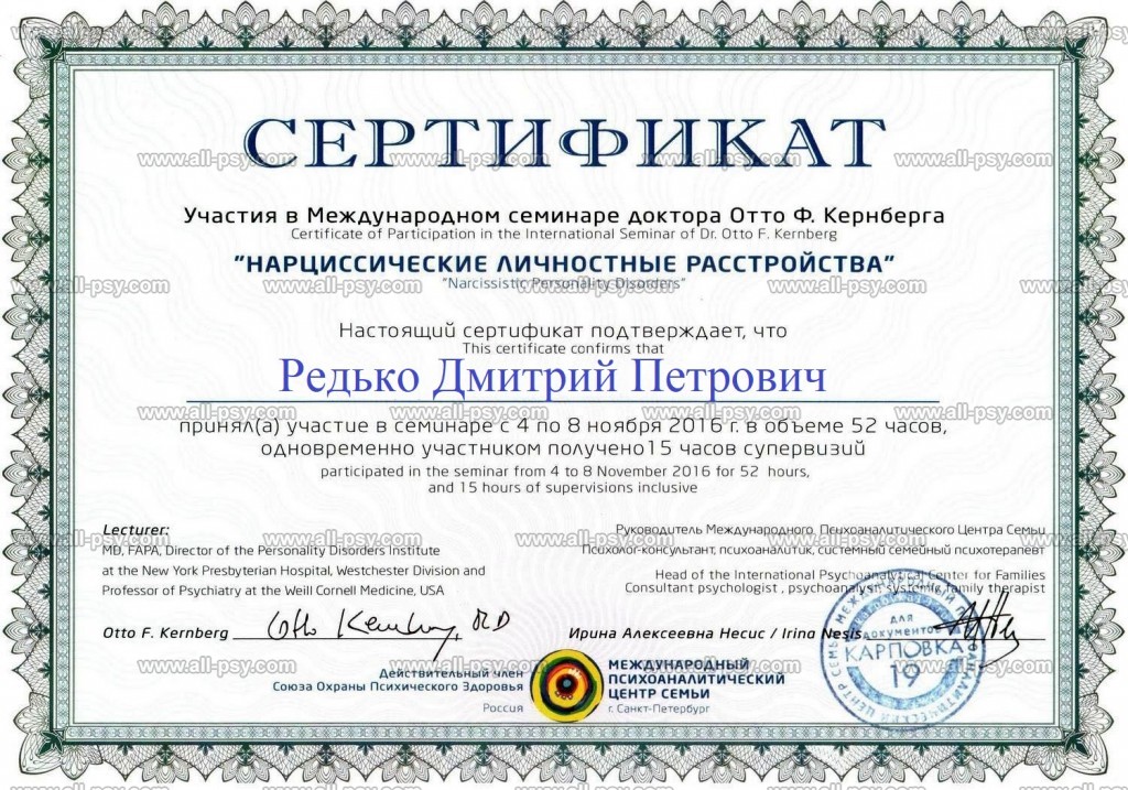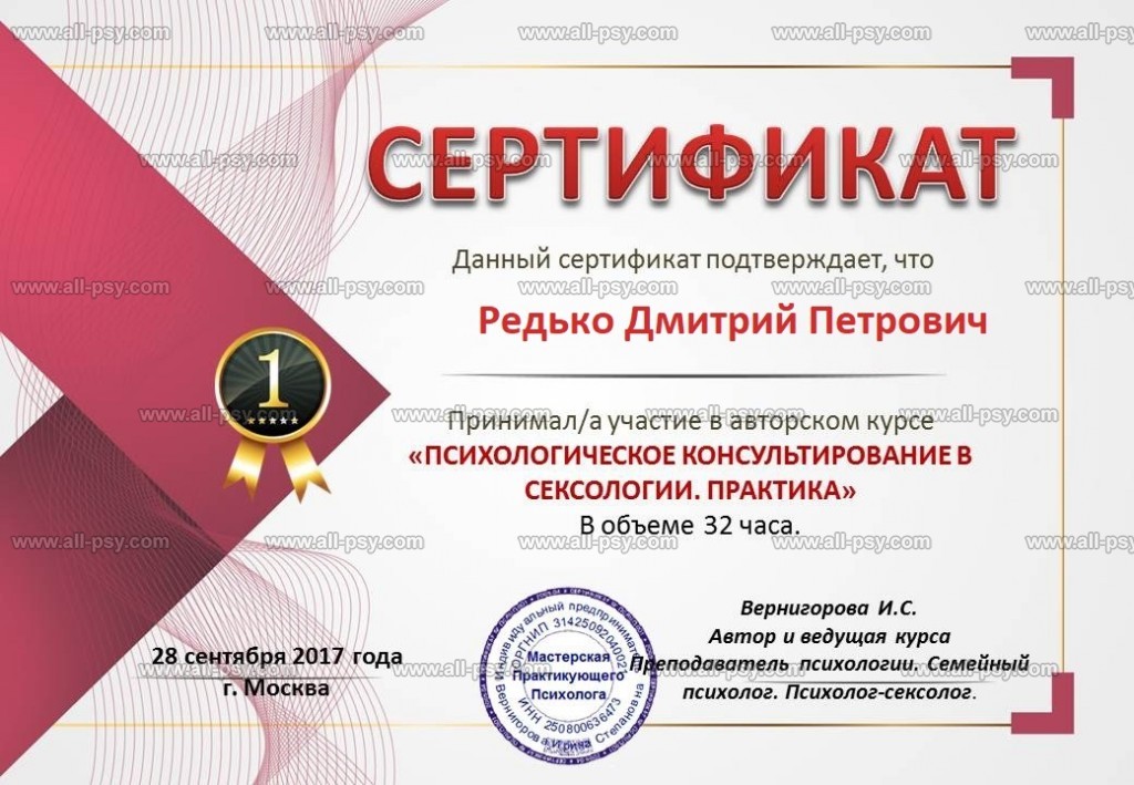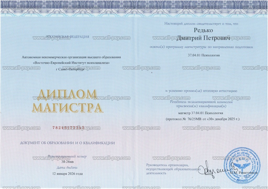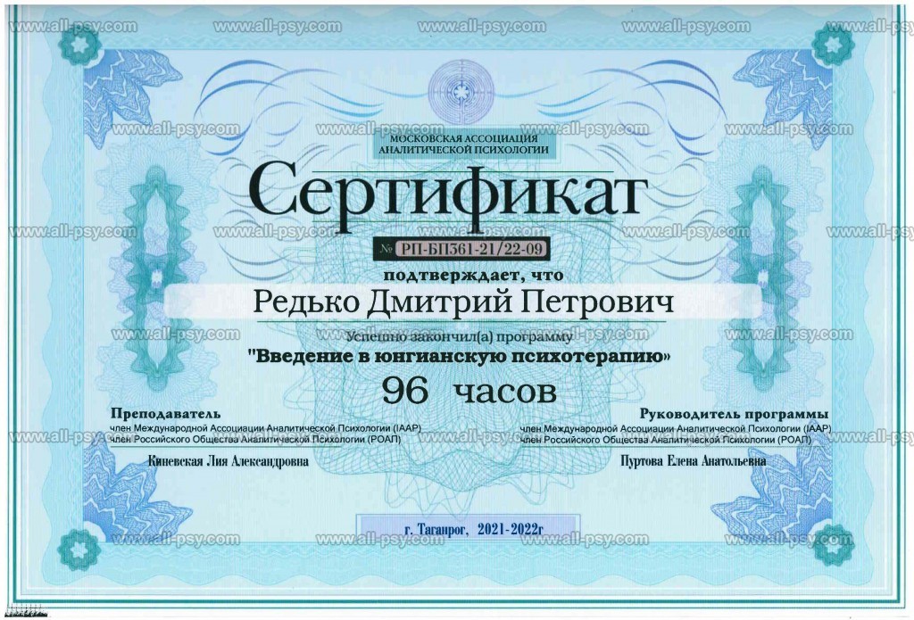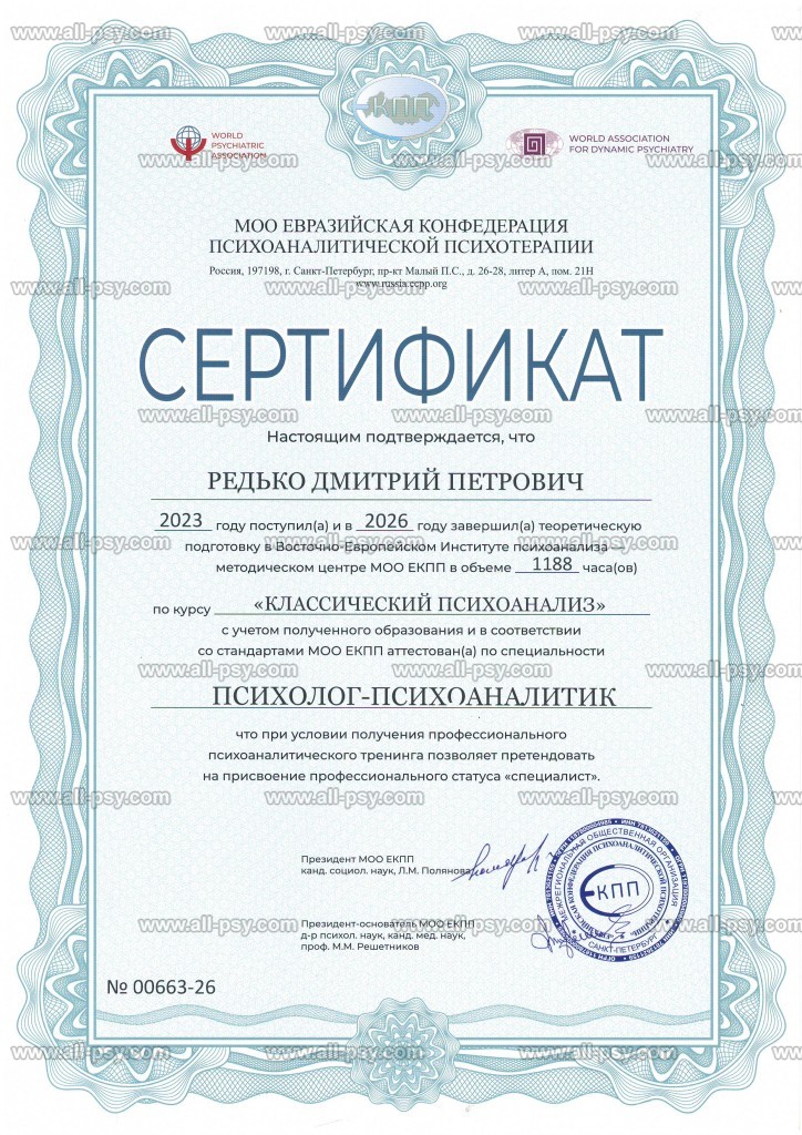 Здравствуйте! Меня зовут Редько Дмитрий Петрович, мне 55 лет, психолог, психоаналитик, магистр психологии, преподаватель психологии. Имею высшее психологическое и психоаналитическое образование и опыт психологического консультирования с 2015 года-более 10 лет. Имею более 100 часов супервизии и 400 часов личной терапии. Работаю в психоаналитическом и интегративном подходах. Регулярно прохожу личную психотерапию и супервизии у более опытных коллег. Ко мне за помощью обращаются клиенты разных возрастов, разного статуса, которые хотят сделать свою жизнь лучше. Буду рад встрече с Вами и совместной работе над Вашим запросом.
