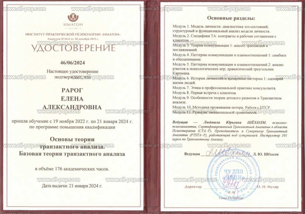Я психолог-консультант. Работаю с применением Транзактного анализа, созданным Эриком Берном. Транзактный анализ - это как теория коммуникации, т.е. как люди общаются между собой, так и теория личности, т.е. то, как люди устроены внутри. На консультациях я помогу вам в безопасной и доверительной атмосфере рассказать вашу историю жизни/проблему, понять и принять ваши чувства, эмоции и потребности, вернуть вам вашу силу и научиться быть автором вашей жизни.