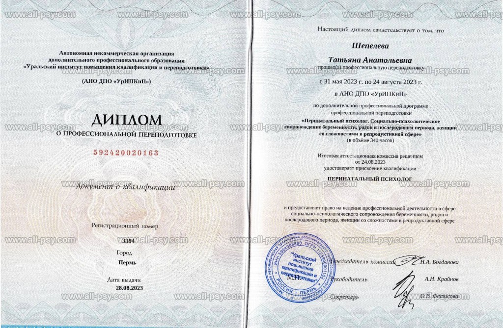 Специализация "Клинический психолог". Имею доп.квалификацию "Перинатальный психолог".