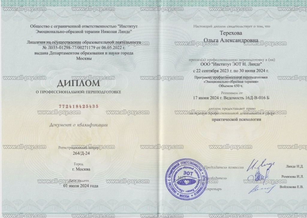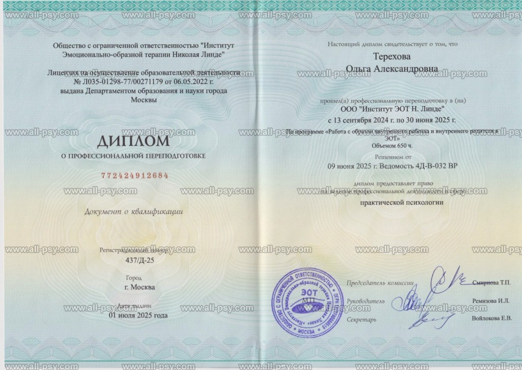 Эмоционально-образная терапия в Центре Н. Д. Линде (с 2024 г. по настоящее время).