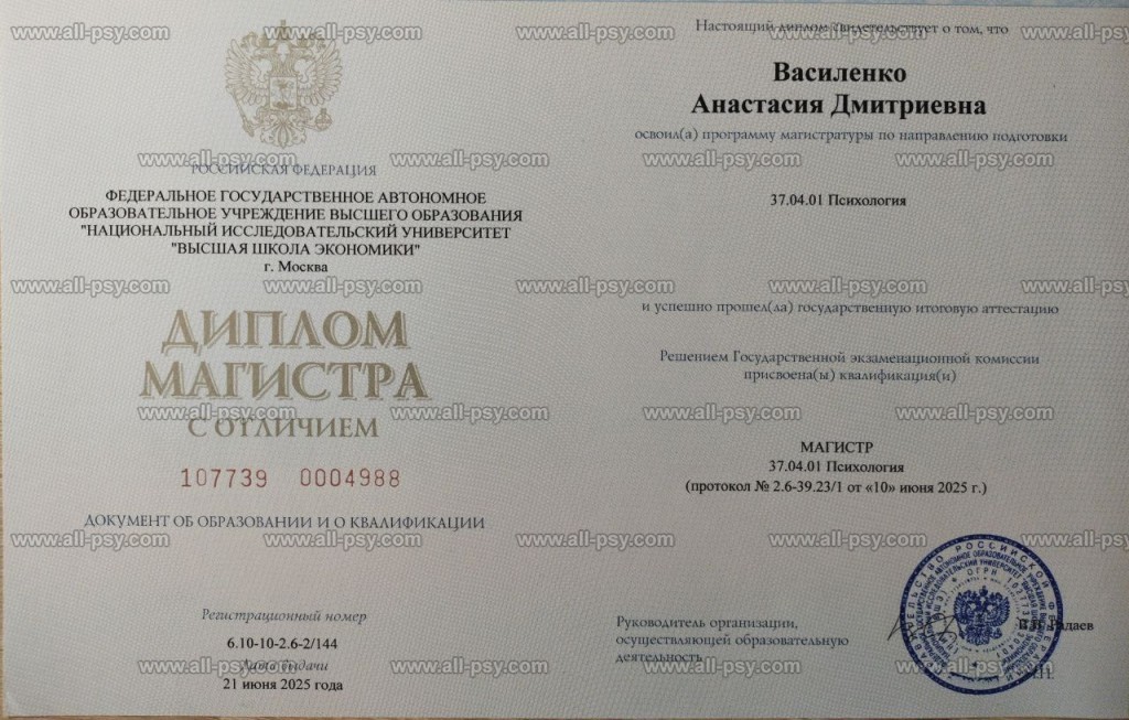 Качество моей работы поддерживается благодаря регулярному изучению нового материала, личной терапии и супервизиям.